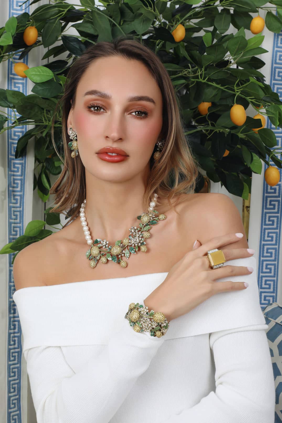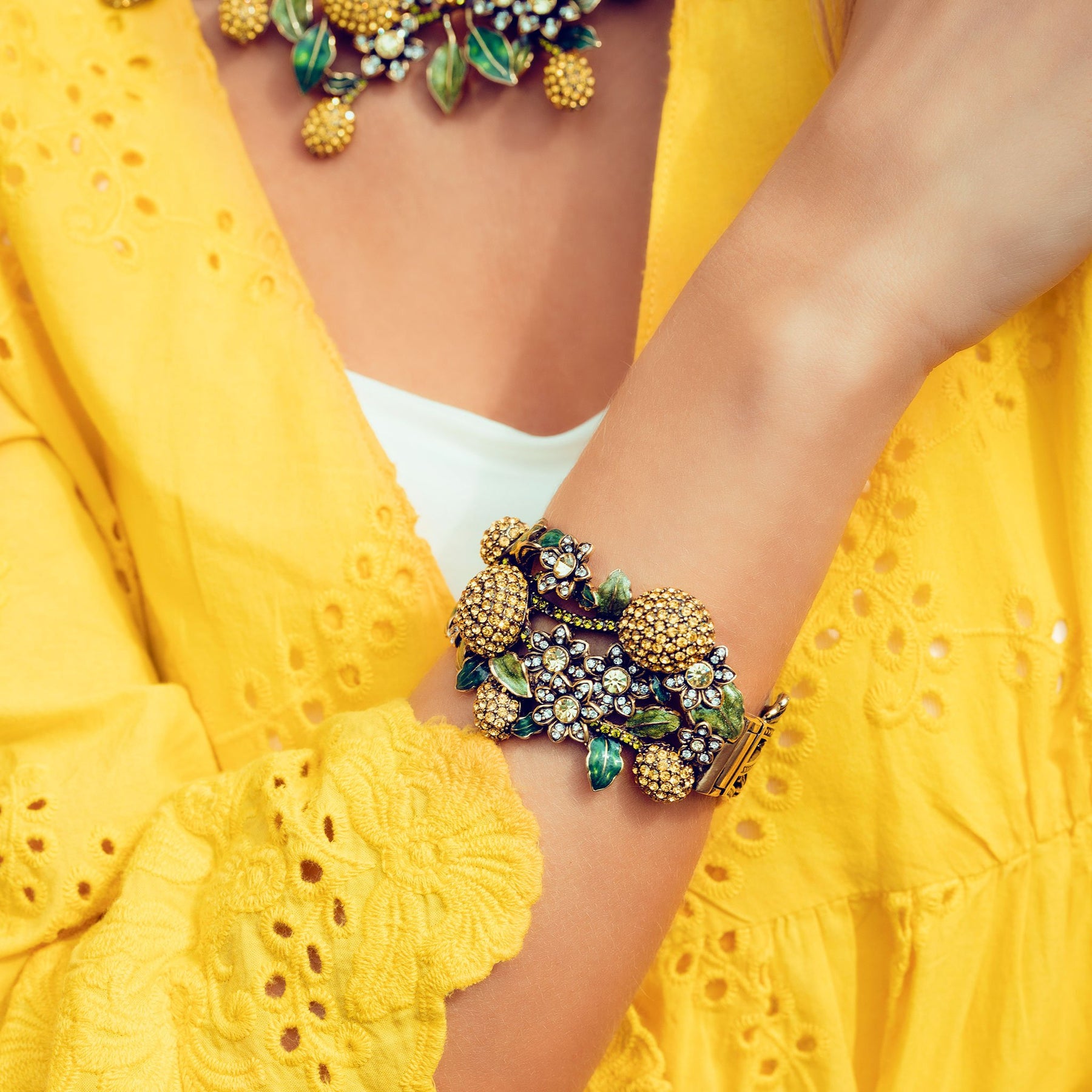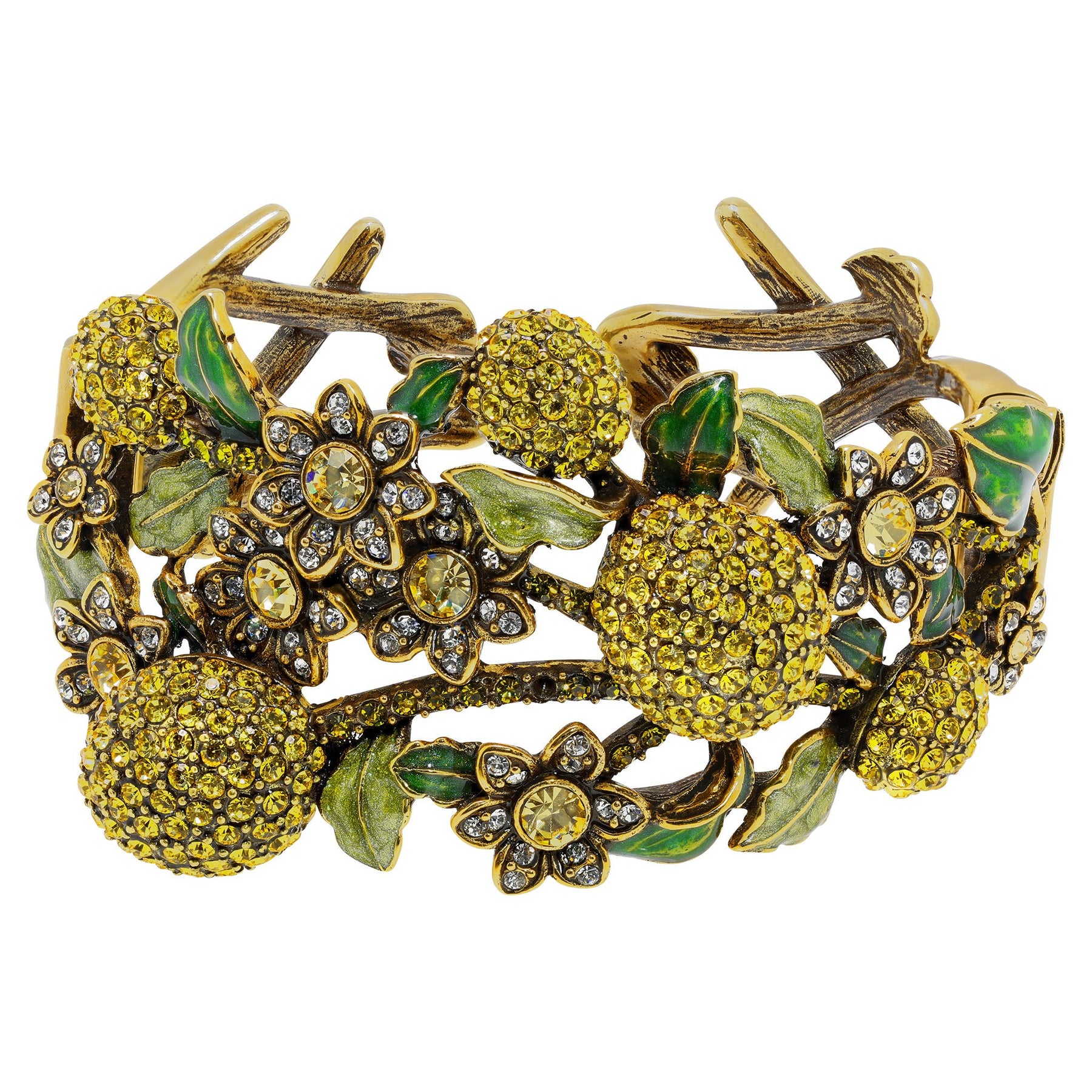 Bold lemon-inspired crystal clusters are paired with delicate floral accents and hand-enameled leaves, creating dimension, texture, and unmistakable Heidi Daus artistry.