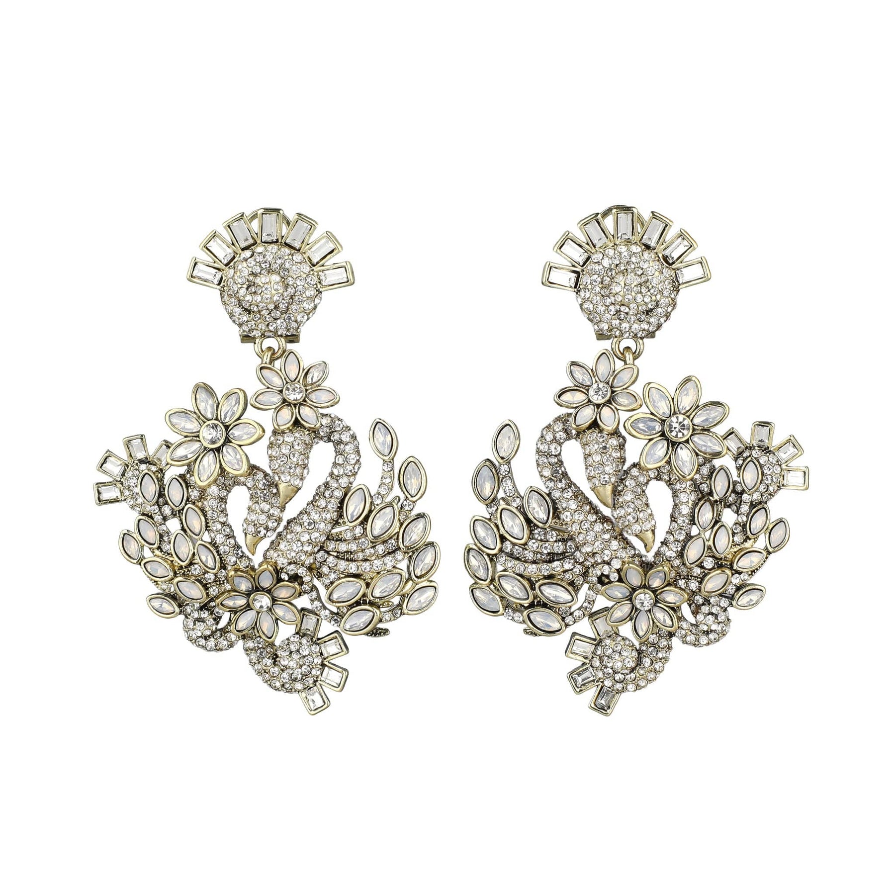 Encrusted with glowing white opal and brilliant clear crystals, these earrings shimmer with a soft, romantic radiance that catches the light with every movement. Delicate floral accents and feathered details add layers of meaning—love that grows, deepens, and unfolds over time. The dramatic drop creates a striking silhouette, framing the face with elegance and intention.