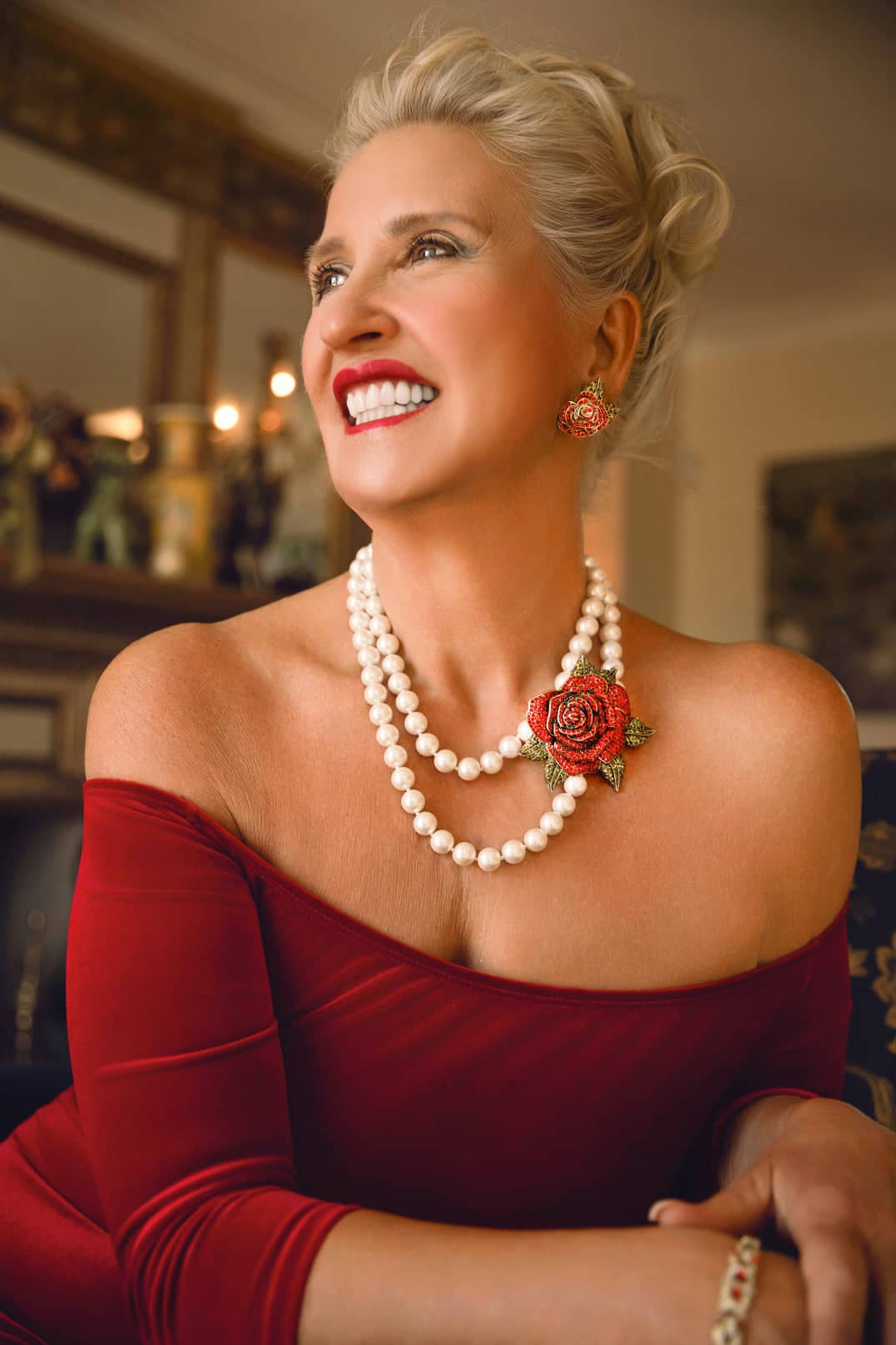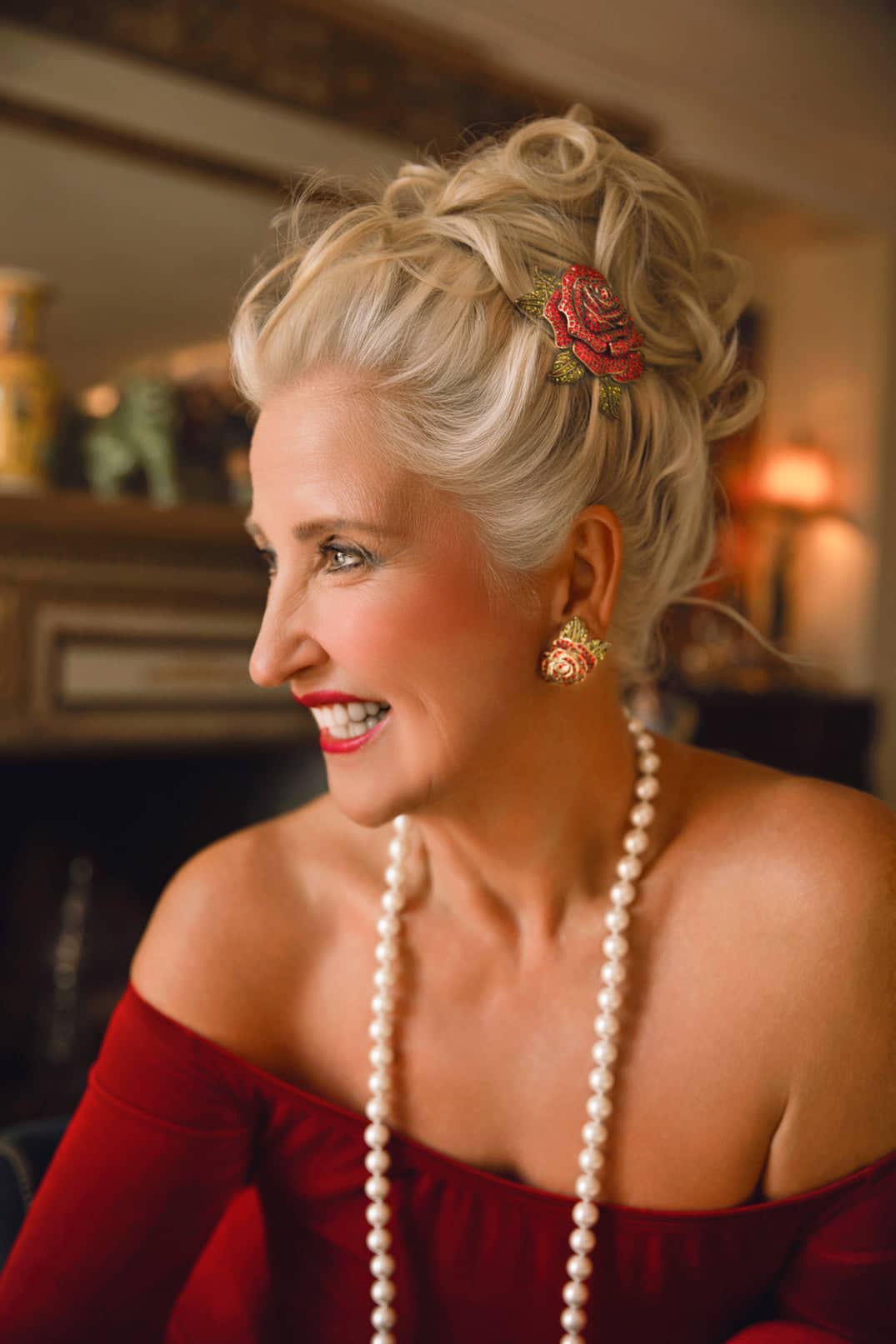 Woman with styled hair and pearl necklace in a warm indoor setting