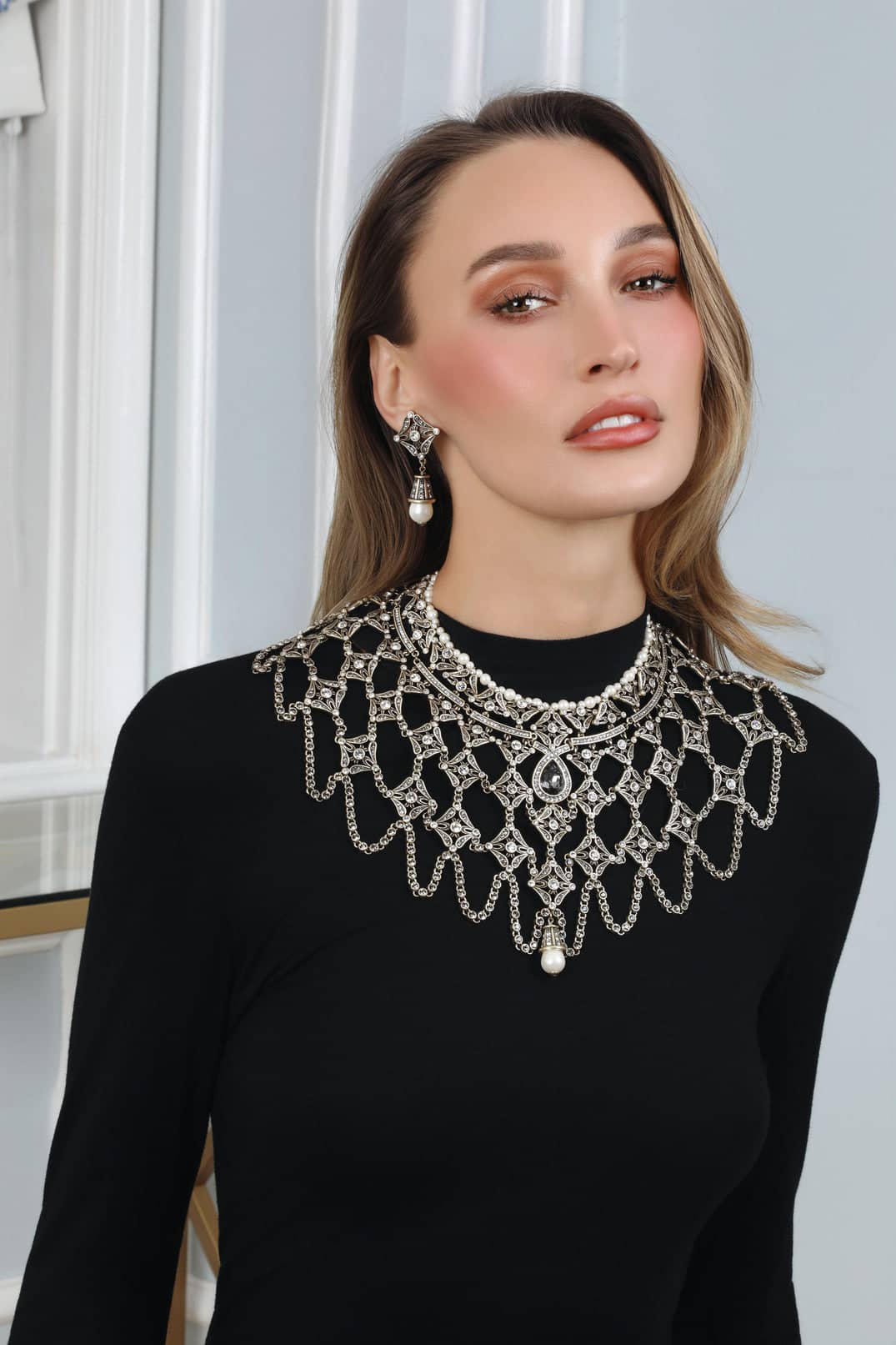 Inspired by the grandeur of historic lace collars and museum-worthy stonework, this extraordinary design unfolds across the neckline like a jeweled scarf—fluid, flattering, and impossibly elegant. Thousands of black diamond and clear crystals are meticulously arranged in an openwork lattice that feels regal without heaviness, dramatic without stiffness. Cream-toned beads softly frame the collar line, while a teardrop crystal crowned with a luminous pearl anchors the design in timeless sophistication.