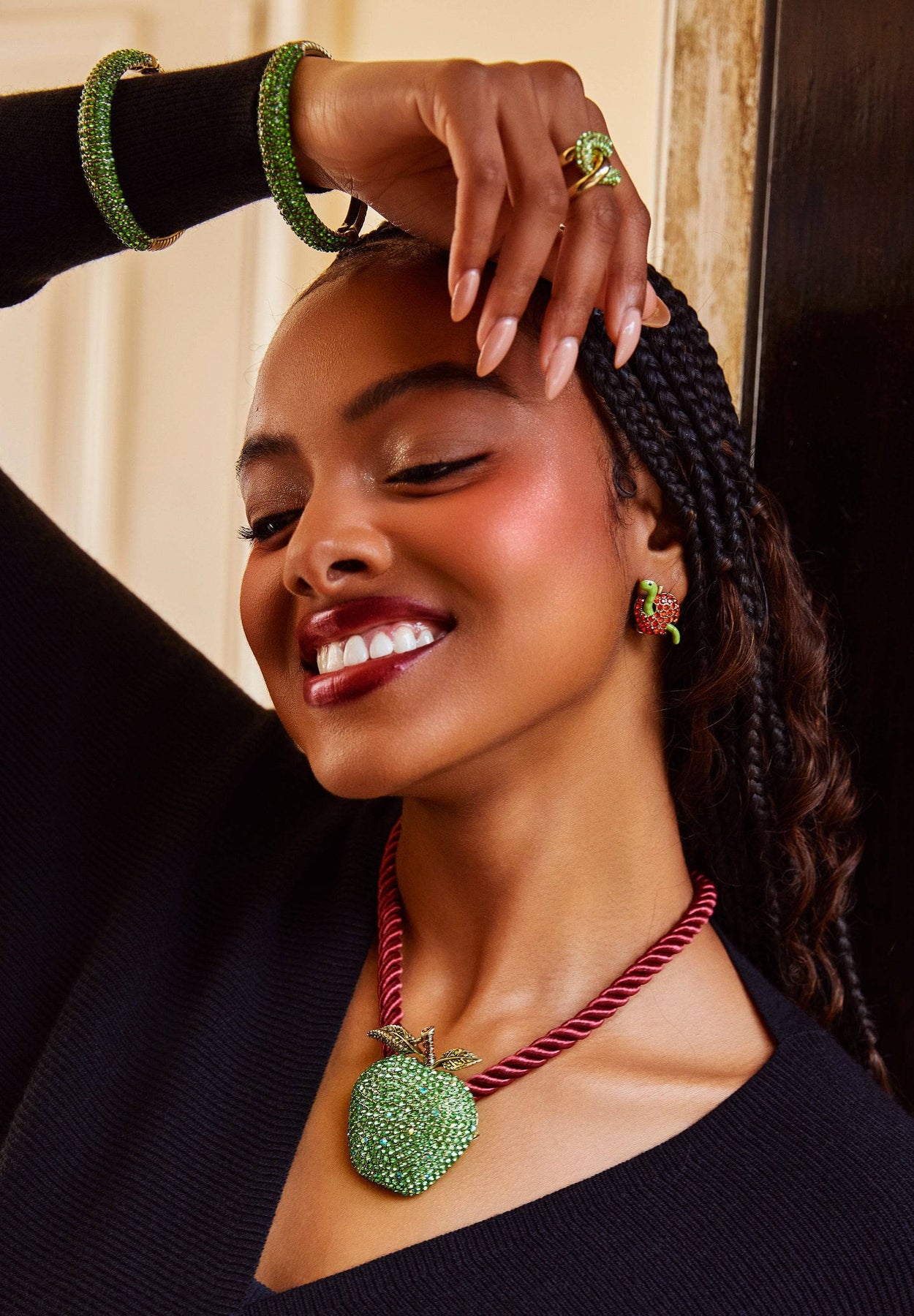 Playful with just the right touch of sparkle, Heidi’s “Teacher’s Pet” Crystal Apple Brooch Pin is a perennial favorite that shines season after season. Available in two dazzling colorways—classic multicolor red-to-gold ombré and vibrant green—each apple is rendered in brilliant crystal pavé with coordinating stem and leaves, all edged in Heidi’s signature bronze tone.