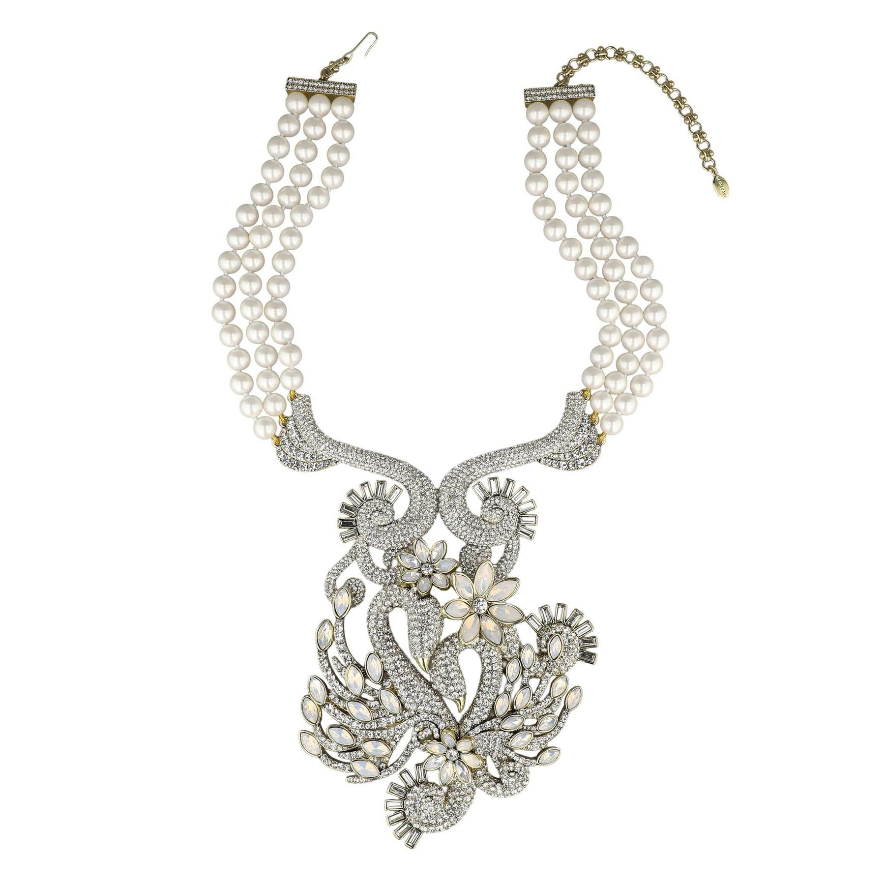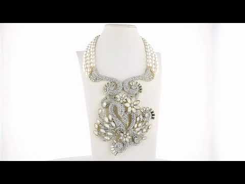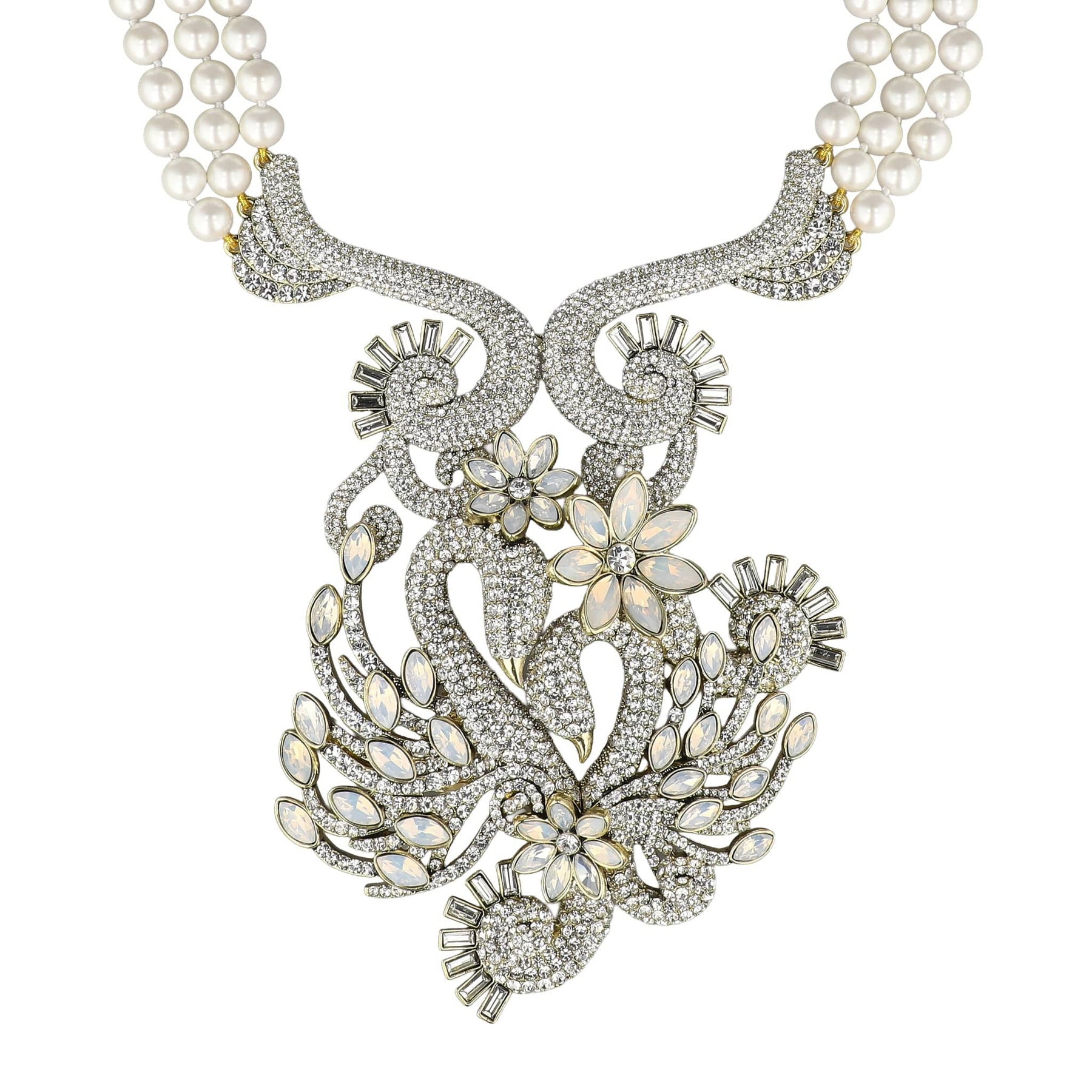 A cascade of luminous white cream–colored beads leads to a magnificent crystal-encrusted centerpiece, where shimmering white opal and clear crystals glow with softness and strength. The dramatic drop creates a powerful focal point—an unmistakable statement that speaks not only to romance, but to commitment, loyalty, and the quiet power of choosing love every day.