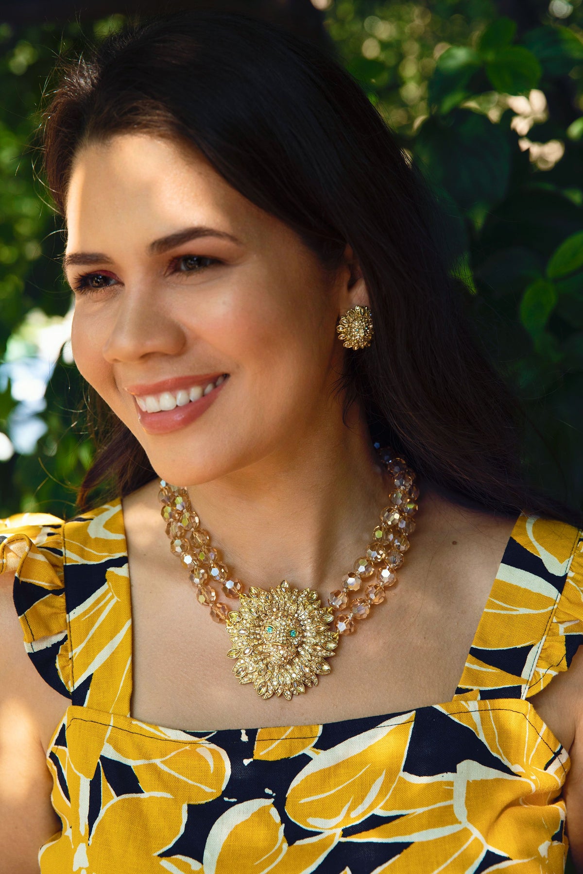 Materials : Faceted crystal golden shadow color beads, crystal golden honey and aquamarine color crystals.