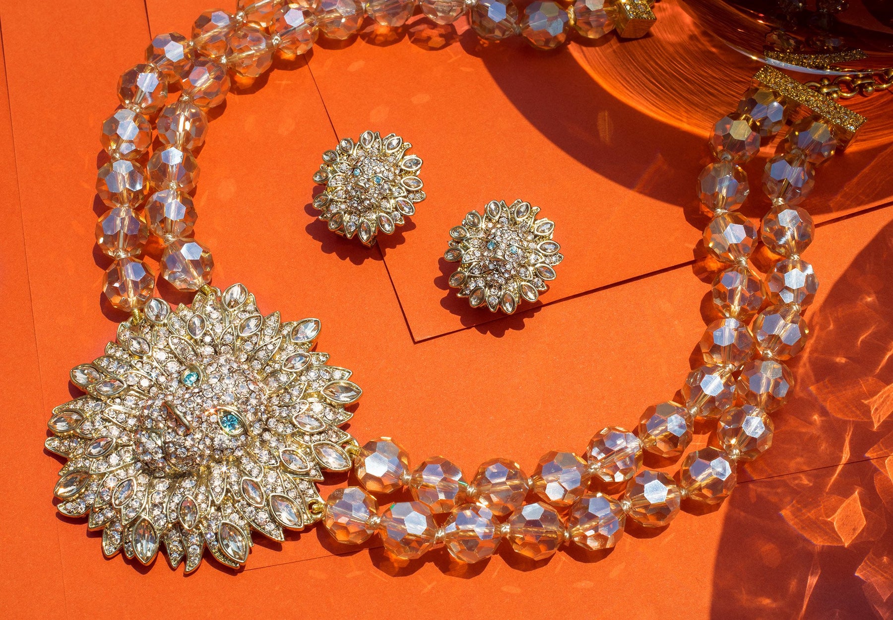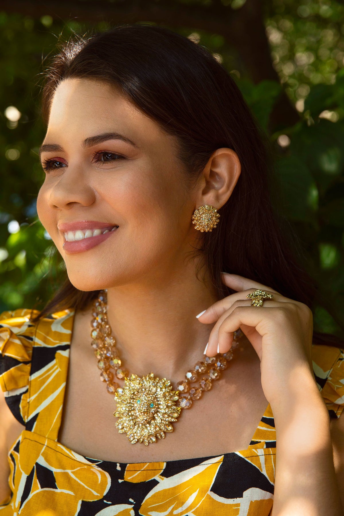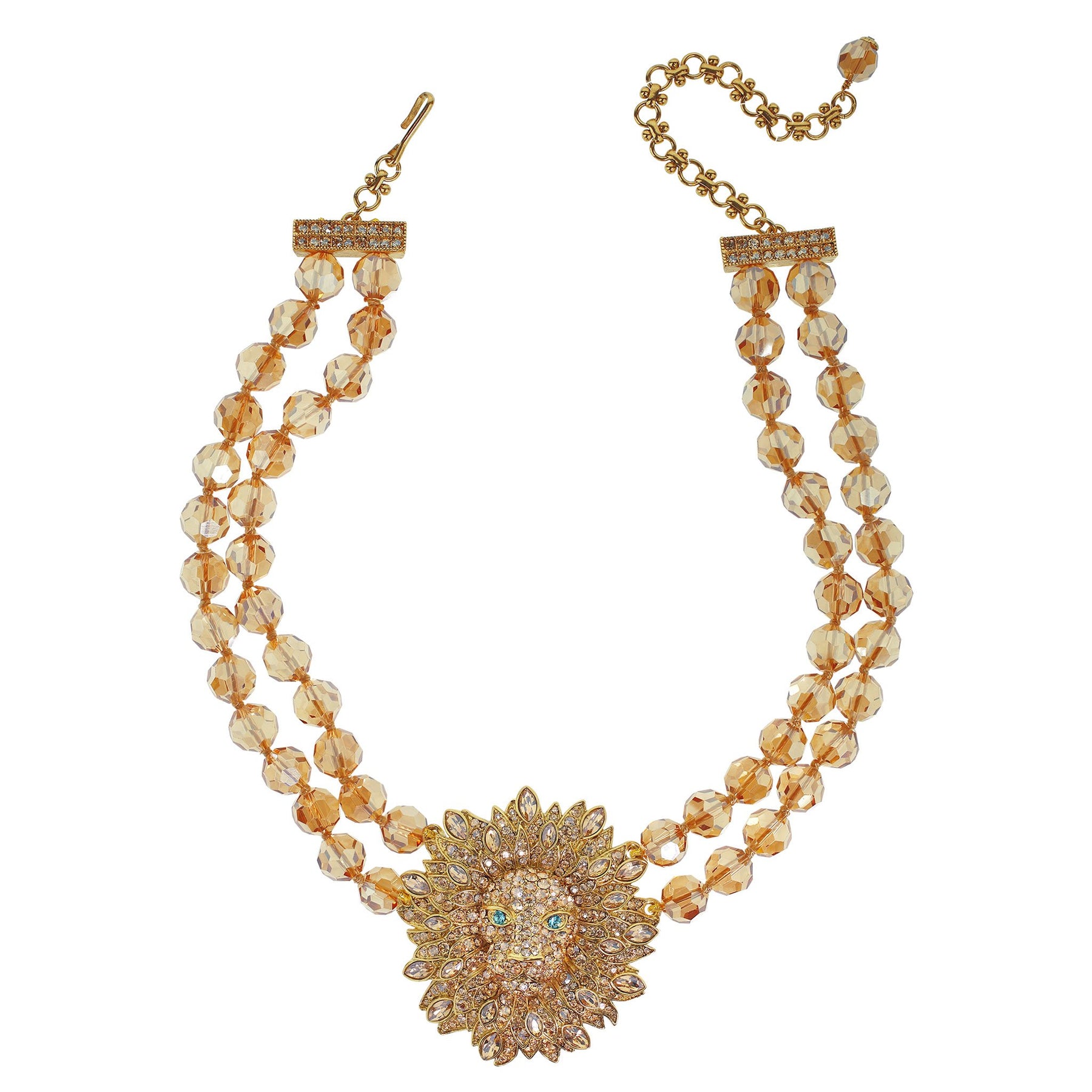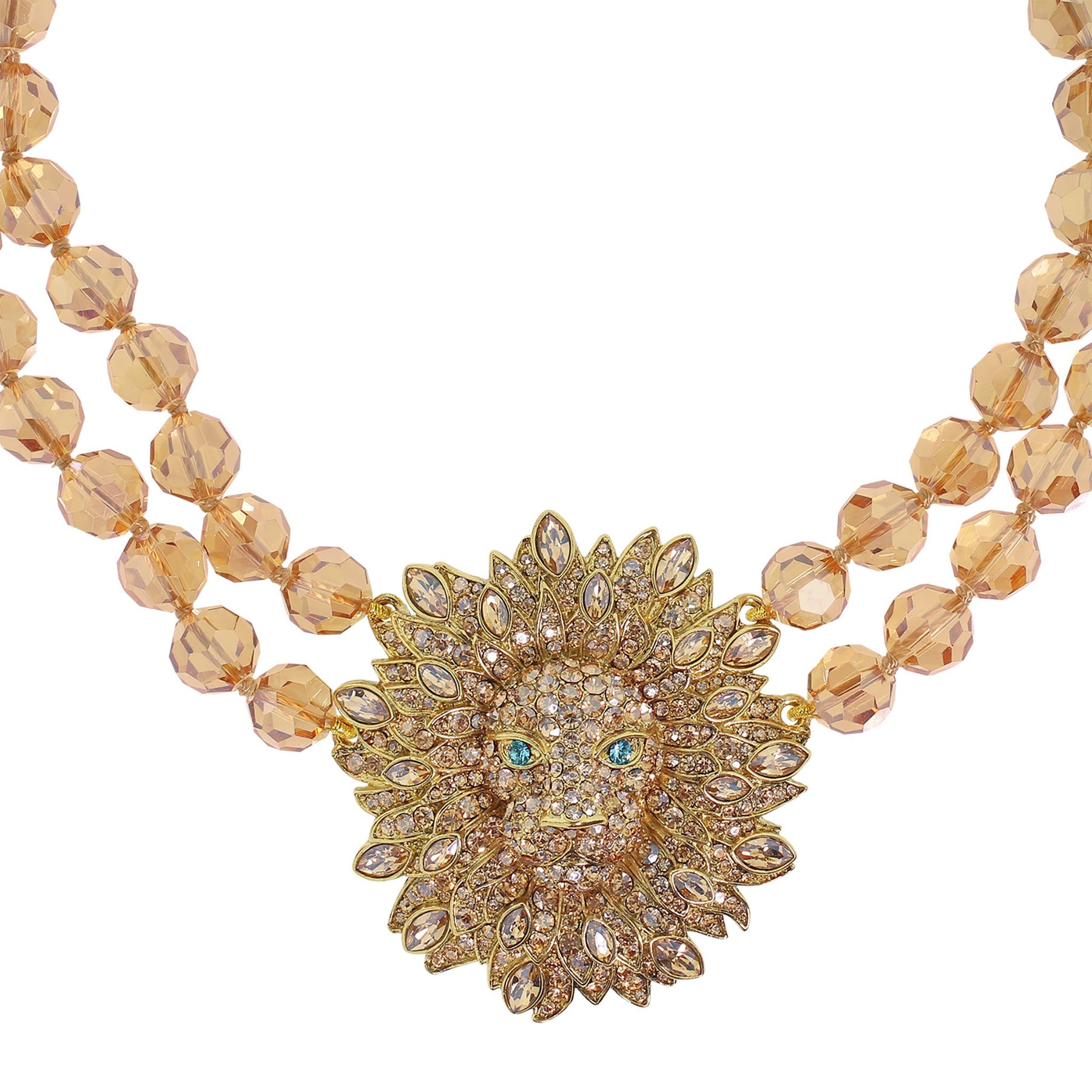 Heidi's "Lion In The Sun" Crystal Lion Necklace adds some powerfully fierce style to everything you pair it with. This handsome lion showcases a golden honey crystal pave body and mane, finished with enchanting aquamarine eyes. Gold tone and diamond crystal pave accents bring this wild style to life. Pair with the matching ring and earrings to complete your look.