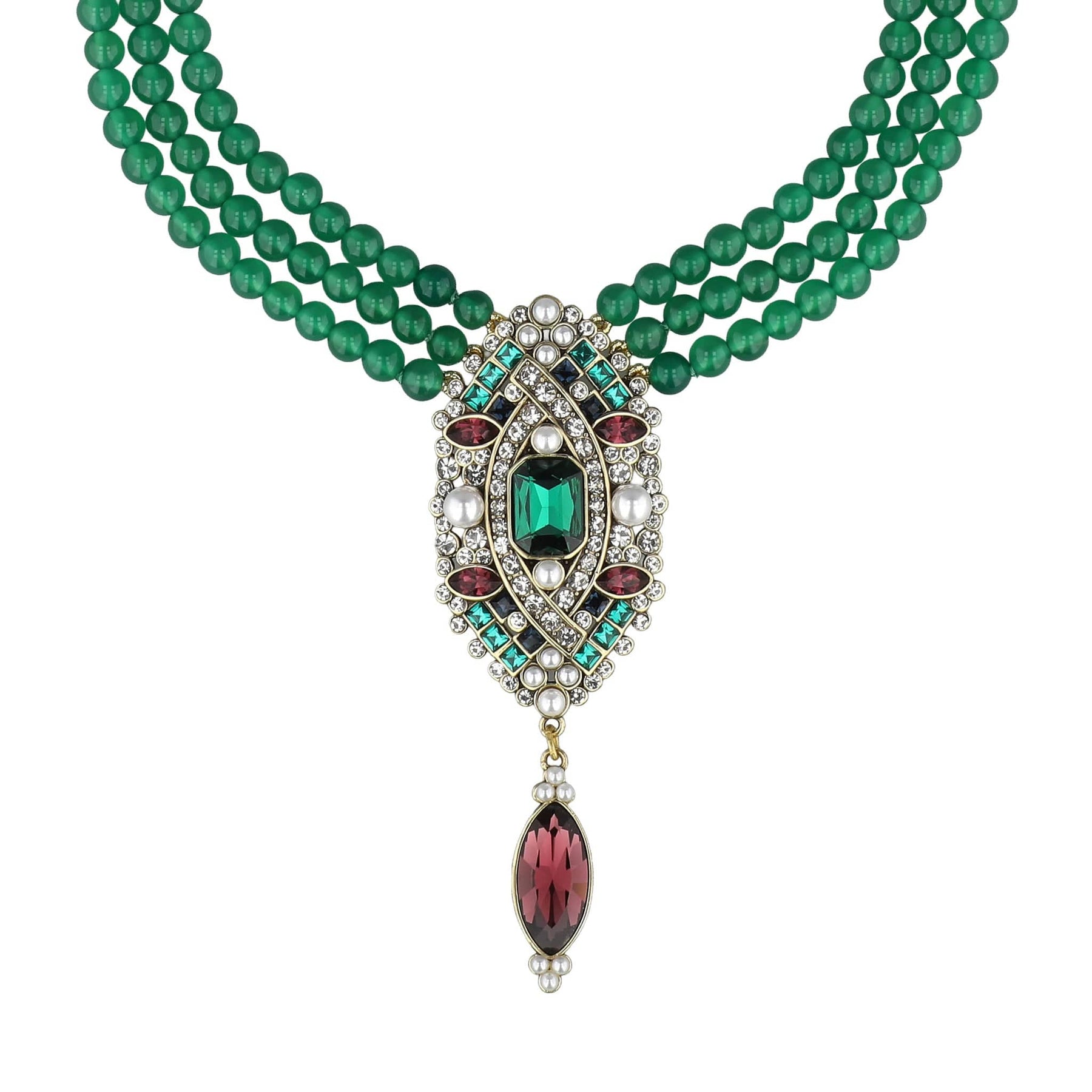 Three strands of lush genuine green agate beads create a regal collar effect, framing an opulent Art Deco center station that glows with emerald, Montana, amethyst, and clear crystals. Each stone is individually set to catch the light—fireplace light, candlelight, and flash-photography light—ensuring you look radiant from every angle.