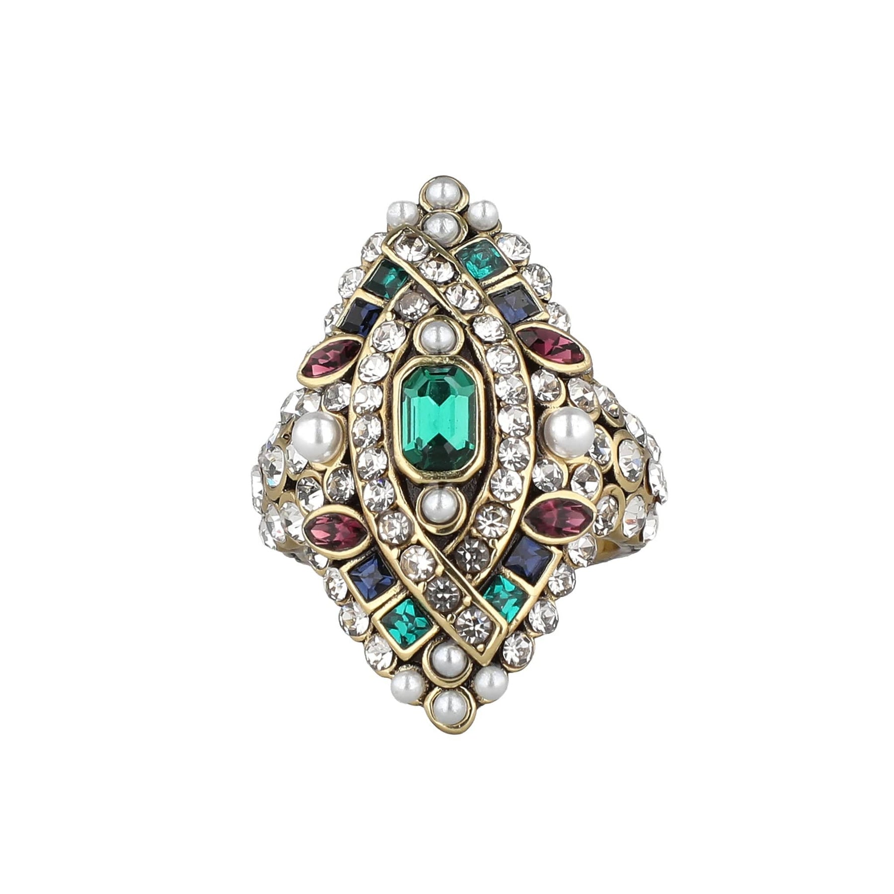 At its center, a radiant emerald-colored crystal glows with depth and dimension, framed by meticulously handset Montana, amethyst, and clear crystals. White seed beads add an elegant vintage softness, balancing the rich jewel tones and creating a timeless Art Deco silhouette.