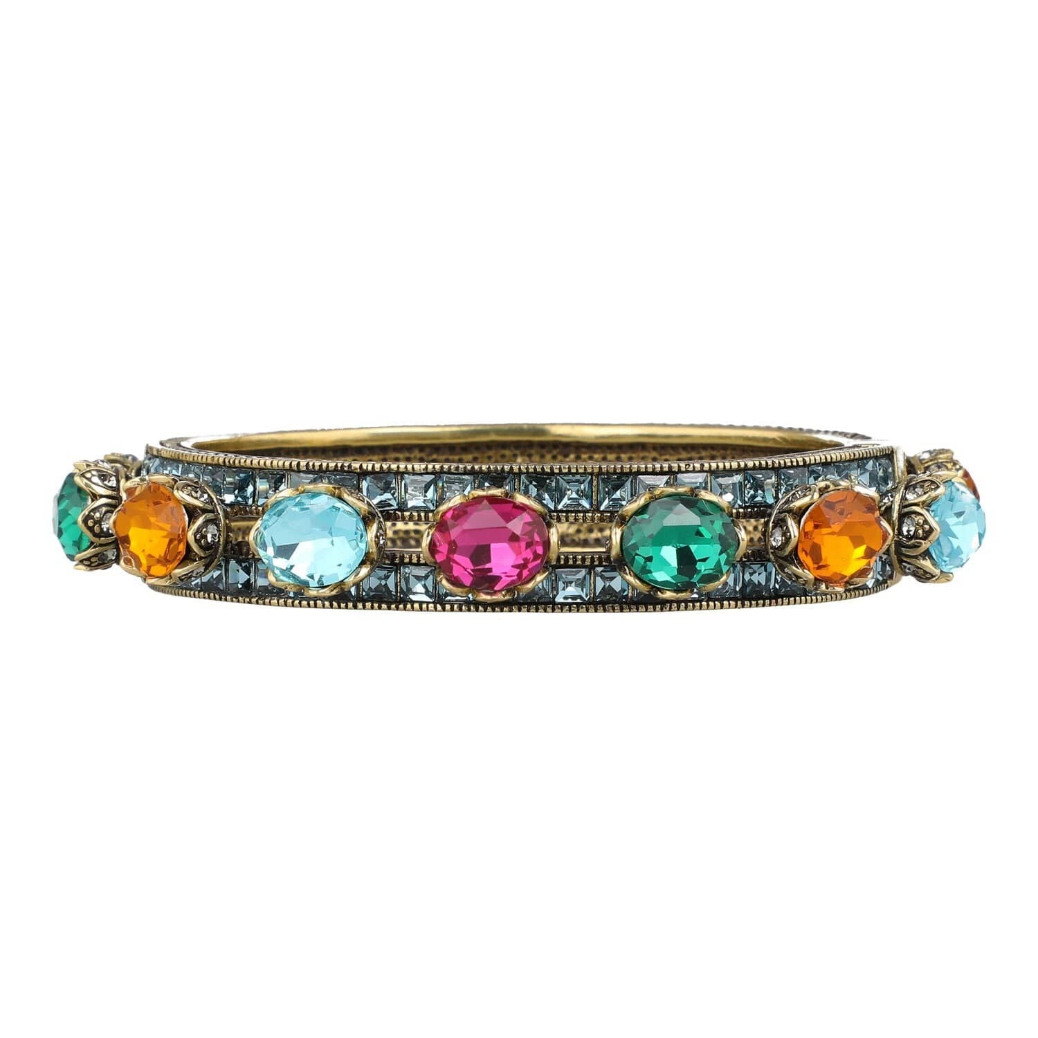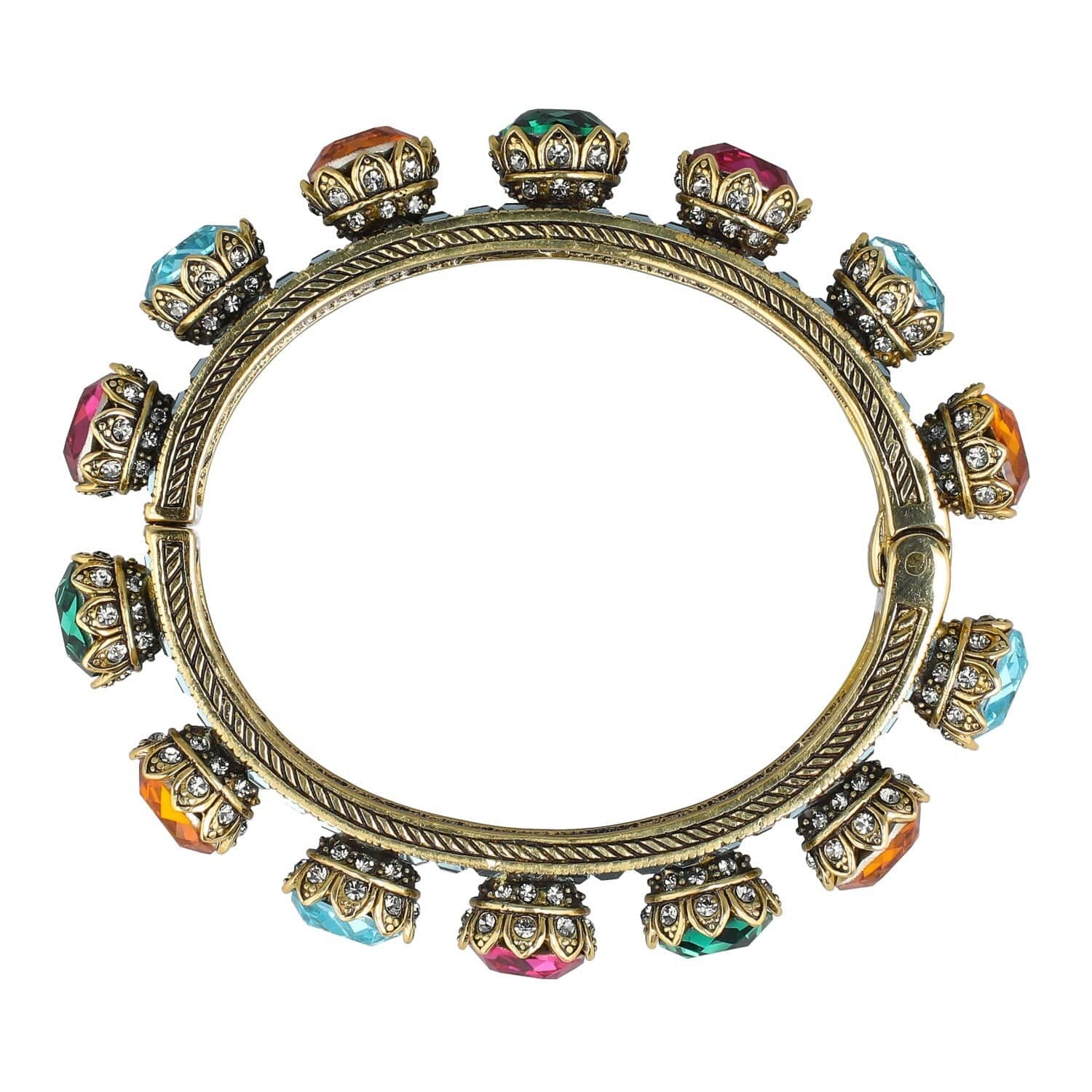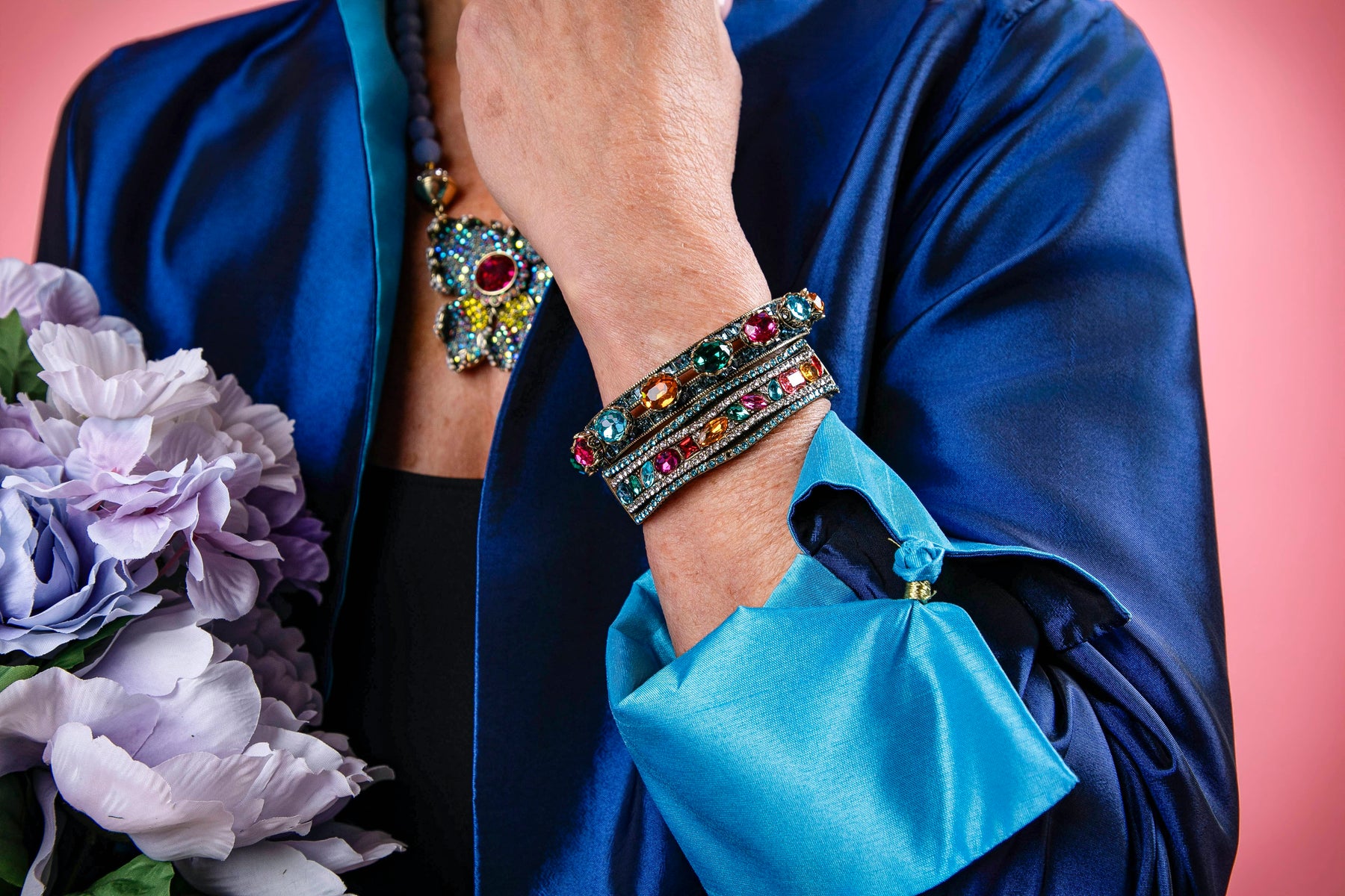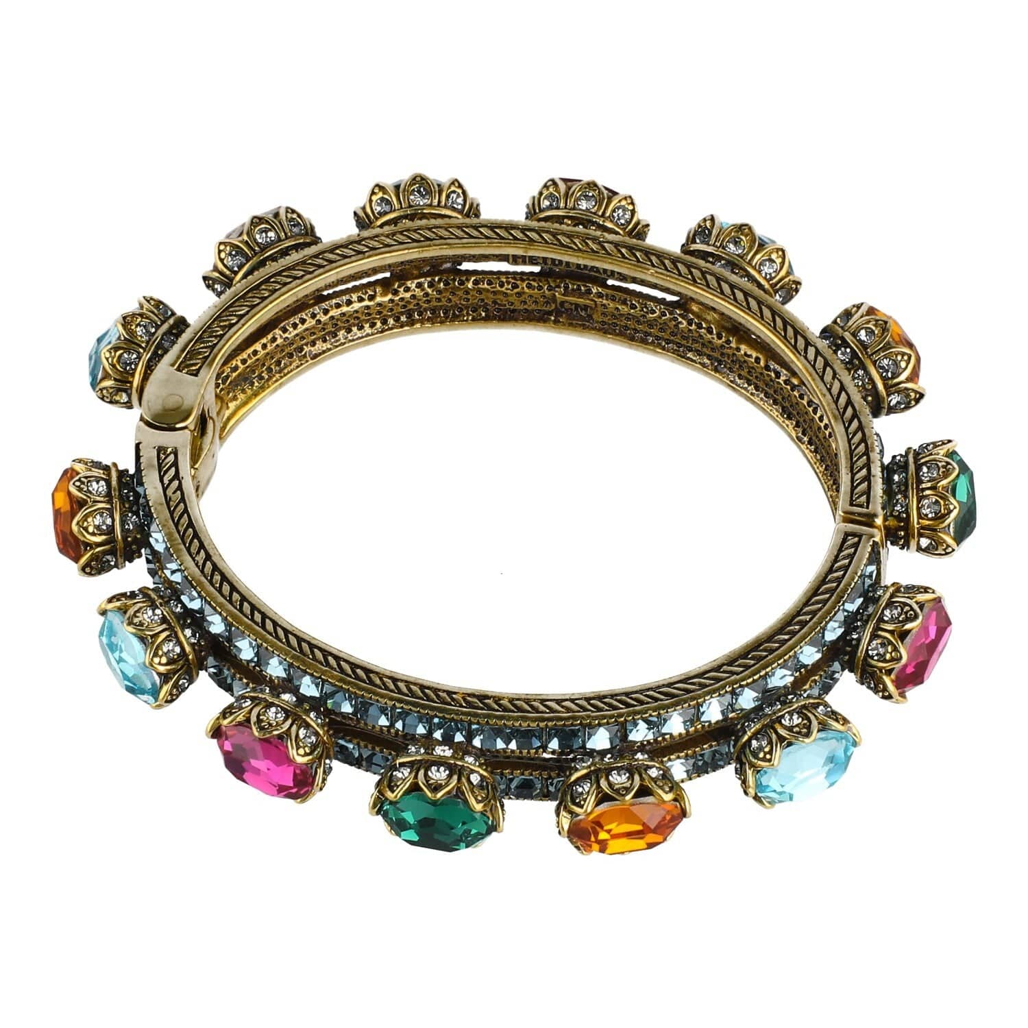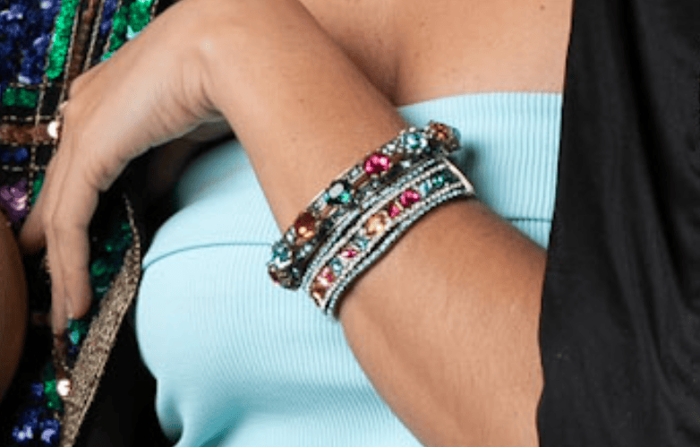 Inspired by the grandeur of Art Deco architecture and the regal symbolism of royalty, “The Crown” Crystal Bracelet is more than an accessory—it’s a declaration. From above, it dazzles with a vibrant mosaic of indicolite, topaz, emerald, fuchsia, light turquoise, and black diamond crystals—each hue playing its part in a symphony of color and light. But it’s from the side where the magic truly reveals itself…