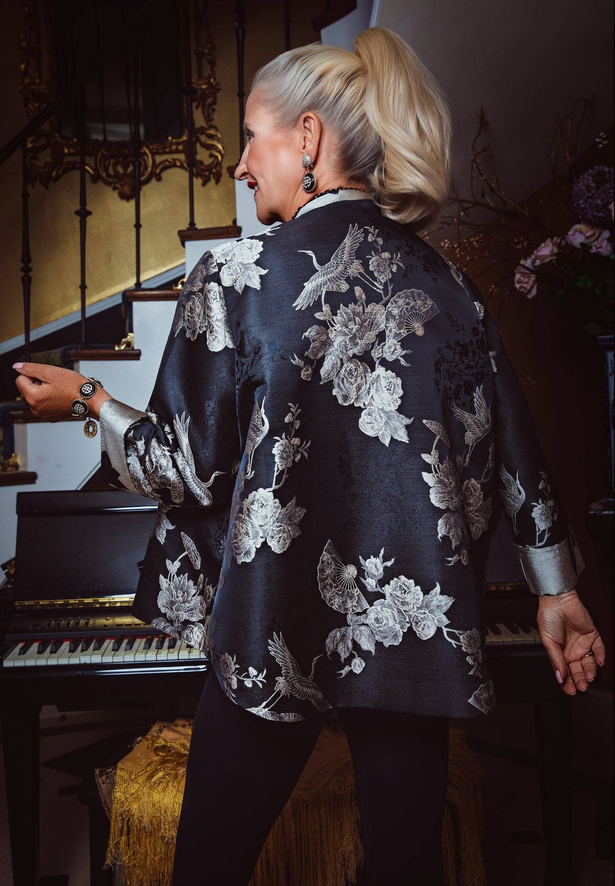 Whether draped over a gown for evening sophistication or paired with chic trousers and bold Heidi Daus jewels for a statement day look, this jacket is more than fashion—it’s an heirloom of artistry, a modern interpretation of Chinoiserie’s storied past.