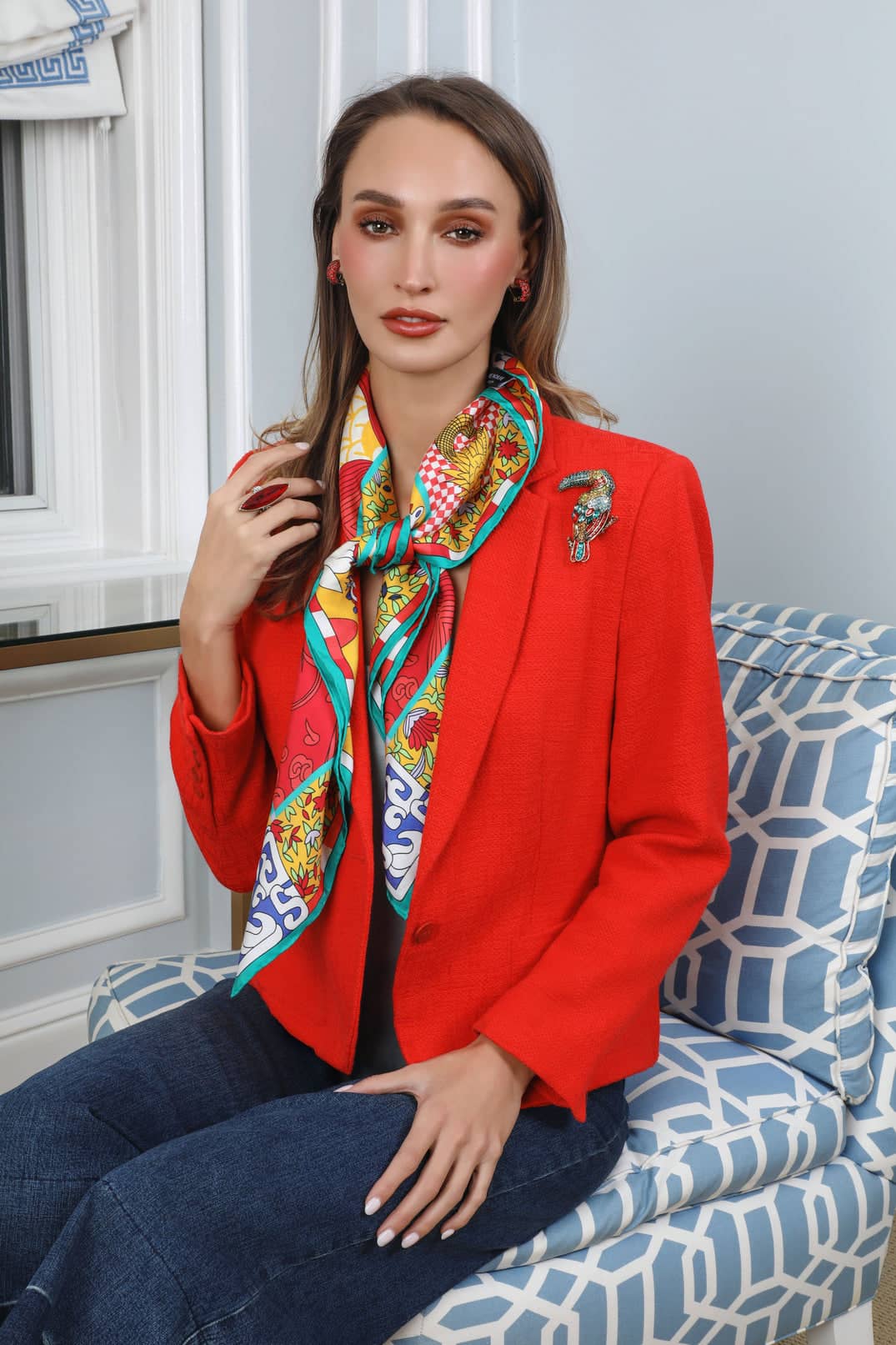 Bright blues, lush greens, fiery reds, and golden tones come together in perfect harmony, creating a piece that instantly lifts your mood and energizes your look. Consider this your wearable reminder that confidence is colorful.