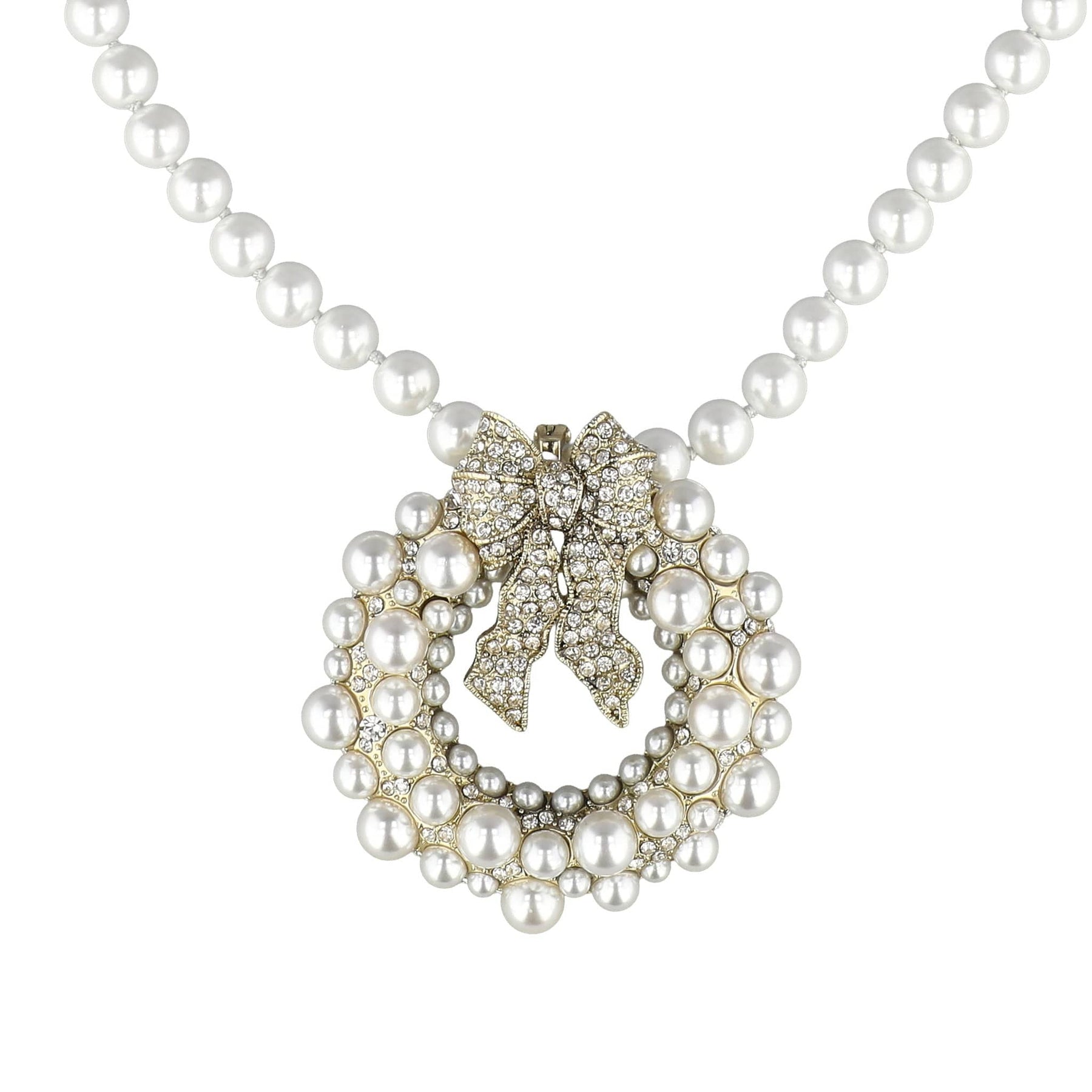 This stunning set begins with a strand of radiant white beads, each one glowing softly like fresh snow under moonlight. Suspended at the center is a beautifully sculpted holiday wreath, crowned with a delicately pavéd bow that shimmers like frost on a December morning.