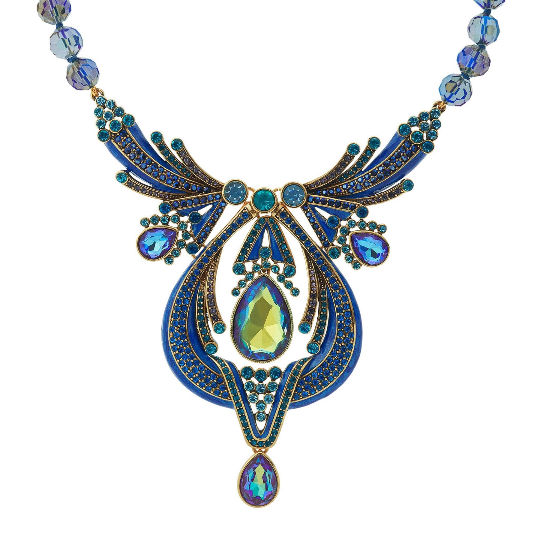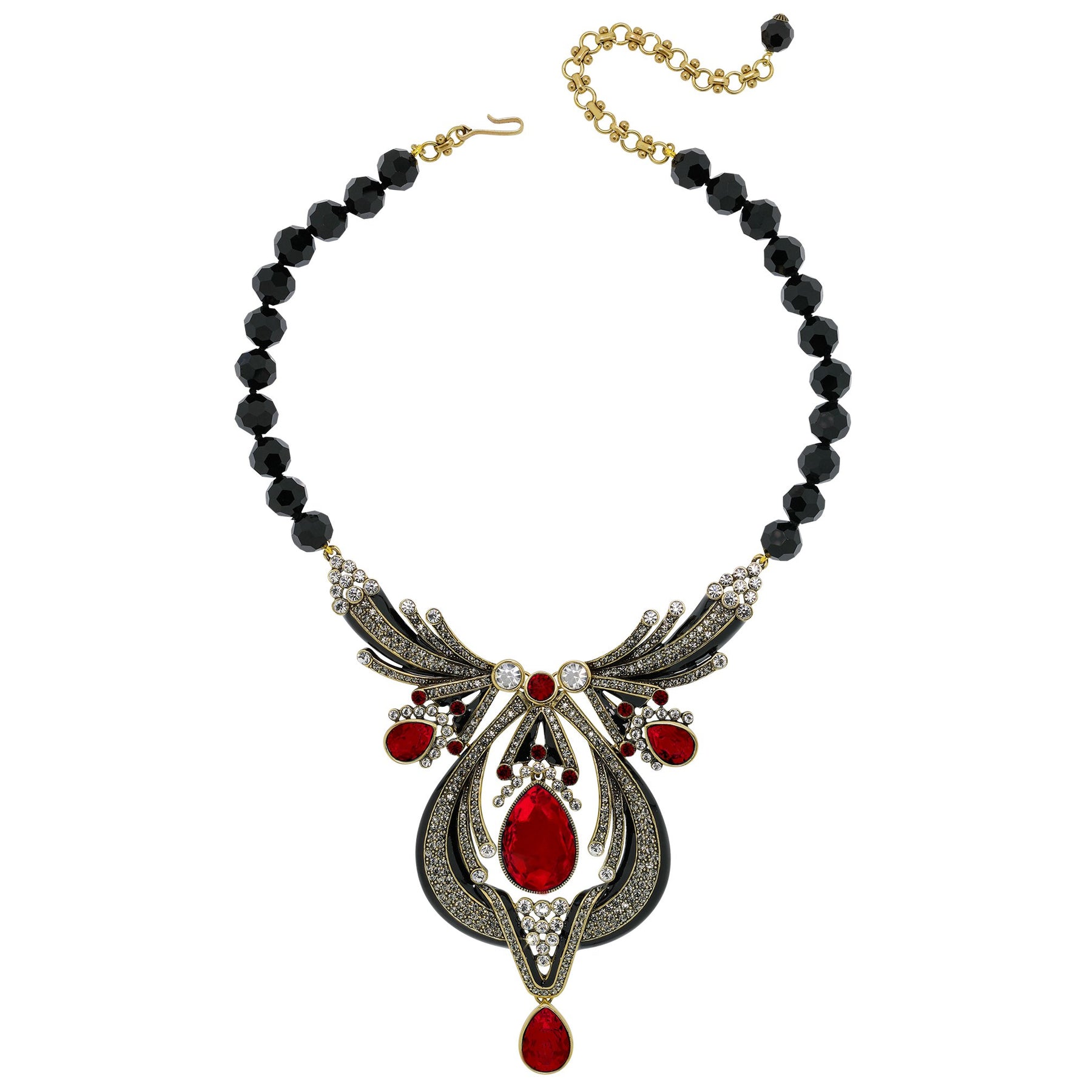 A strand of individually hand-knotted, faceted jet-black beads draws the eye toward a breathtaking centerpiece—an architectural marvel of sweeping black enamel curves, pavé-set clear crystals, and radiant aquamarine stones. At its heart, a luminous pear-shaped crystal sparkles with old-Hollywood sophistication, framed by cascading accents that shimmer with movement and light.