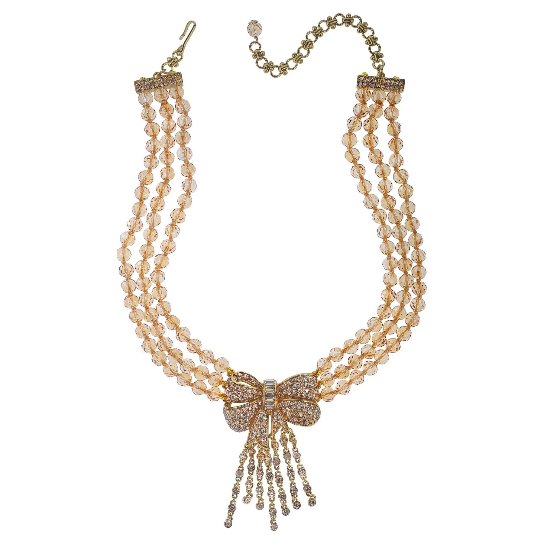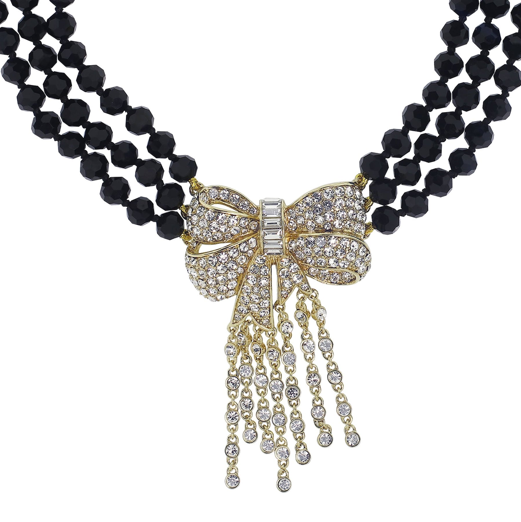 Three strands of richly hued beads lead to a breathtaking crystal bow centerpiece—each shimmering facet a reminder of your power to light up every room you enter. Cascading crystal tassels add a touch of movement and drama, echoing the joy of a ribbon untied, a moment unveiled, and a celebration begun.
