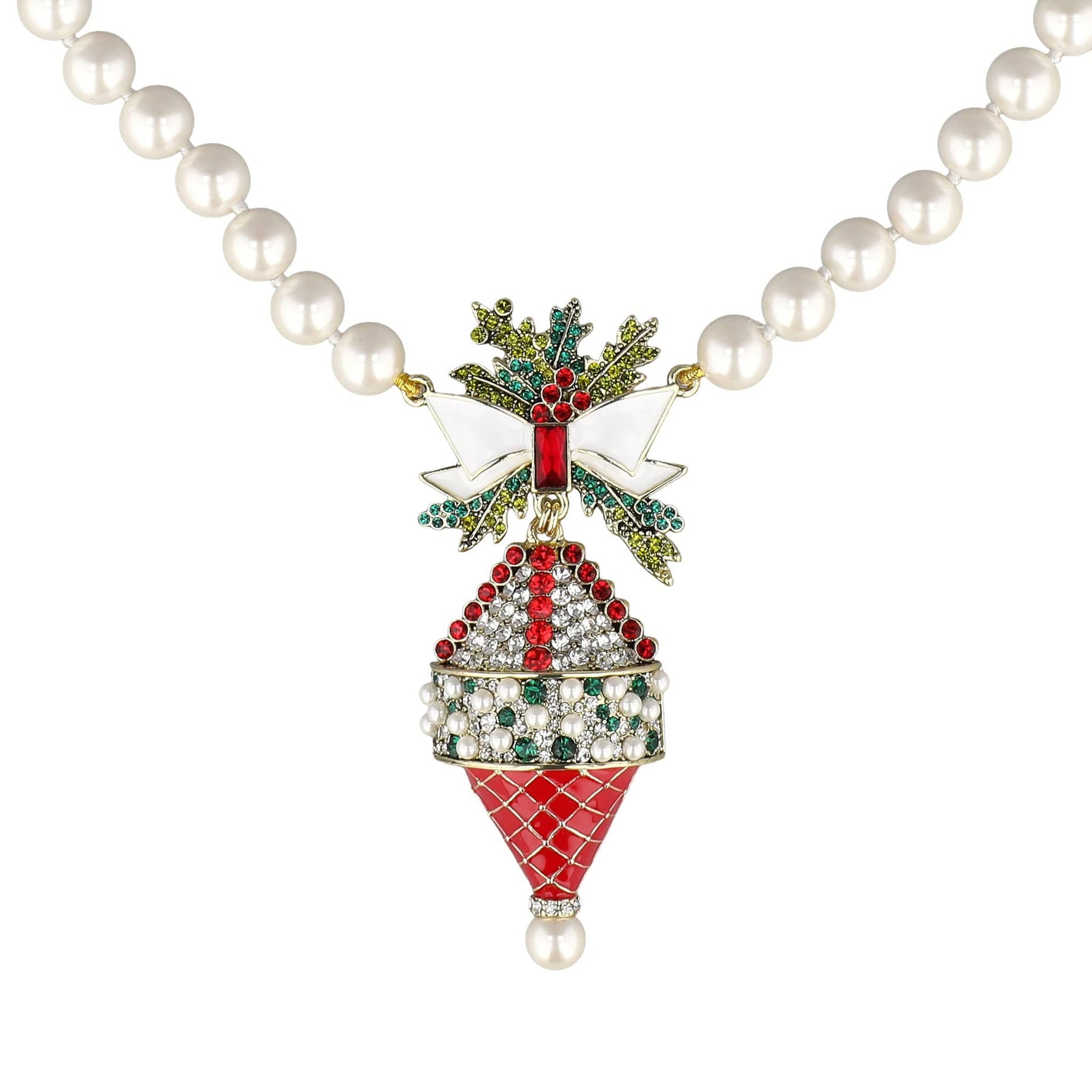 A strand of creamy, luminous beads sets the stage, evoking the elegance of vintage holiday pearls passed down through generations. At center, the pendant steals the spotlight: a dazzling ornament rendered in vibrant red enamel, glowing white accents, sparkling holly leaves, and brilliant crystals that dance with every flicker of candlelight. The hand-painted bow, the quilted detailing, the dimensional sparkle—every element showcases Heidi’s signature craftsmanship and the heart of her holiday artistry.