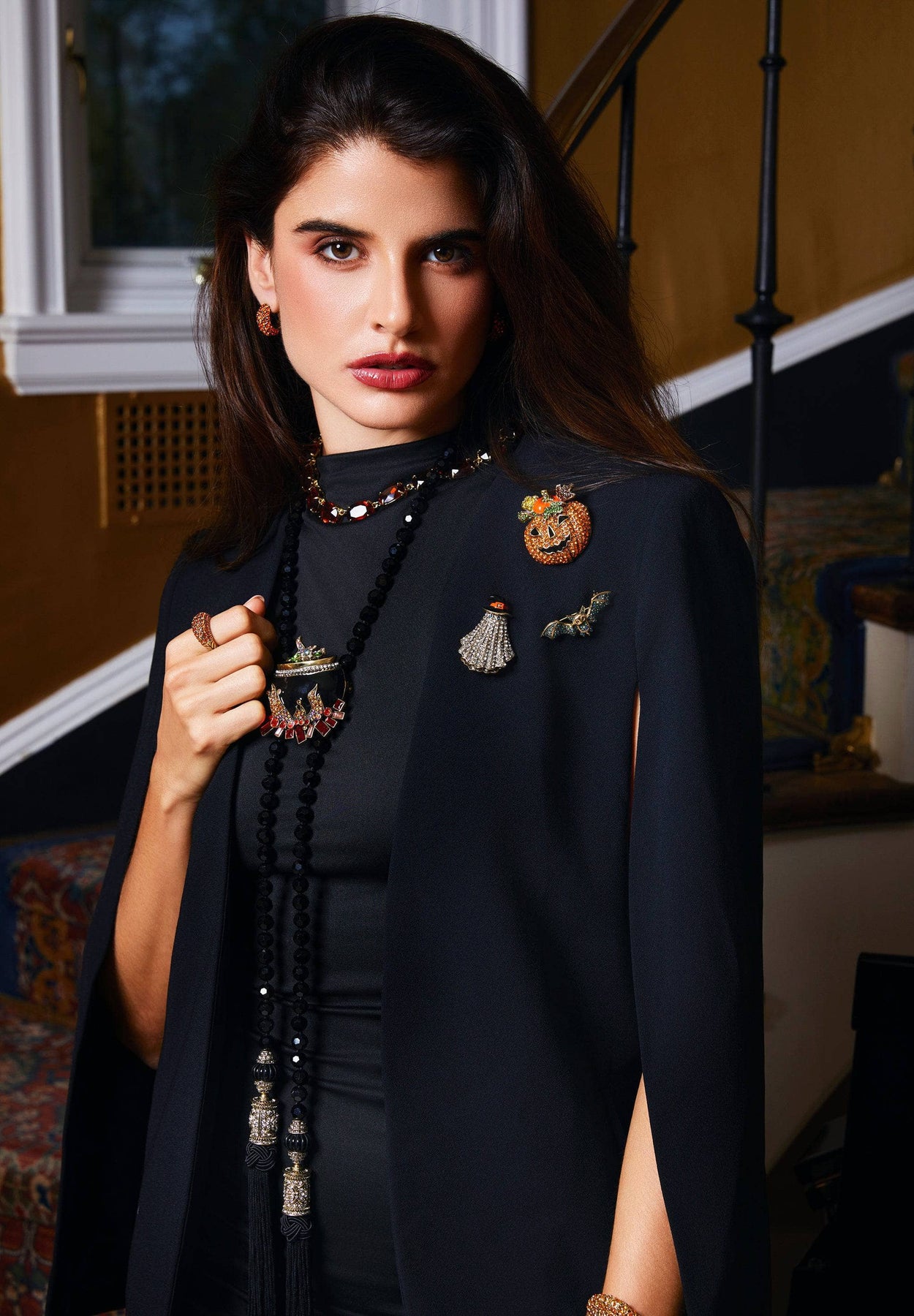 Celebrate the sparkle of the season with the Haunted Harvest Trio—a dazzling set of pins featuring three of Halloween’s most iconic companions: a whimsical jack-o’-lantern, a crystal-dusted ghost in a witch’s hat, and a jewel-toned bat ready to take flight. Each piece is brought to life in signature Heidi Daus artistry, with a rich palette of enamel and hand-set crystals in black, orange, green, blue, and golden hues that catch the light like autumn magic.