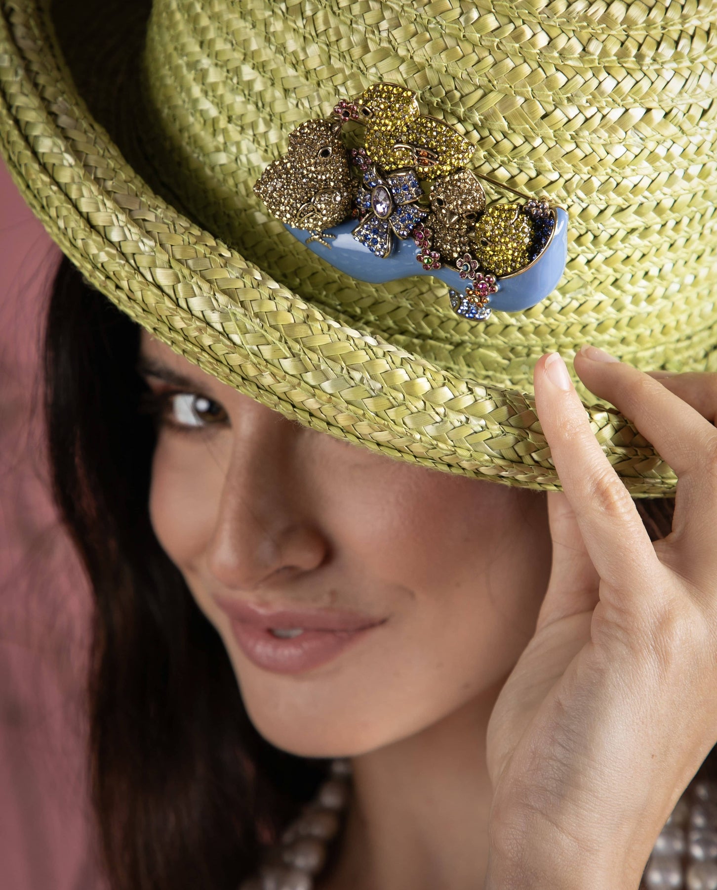 Lavishly detailed with a rainbow of crystals—fuchsia, rose, padparadscha, jonquil, sapphire, tanzanite, violet, and more—this pin is a masterclass in joyful excess. From the glossy light blue enamel shoe to the tiny floral accents and expressive chicks, every detail invites compliments and laughter alike.