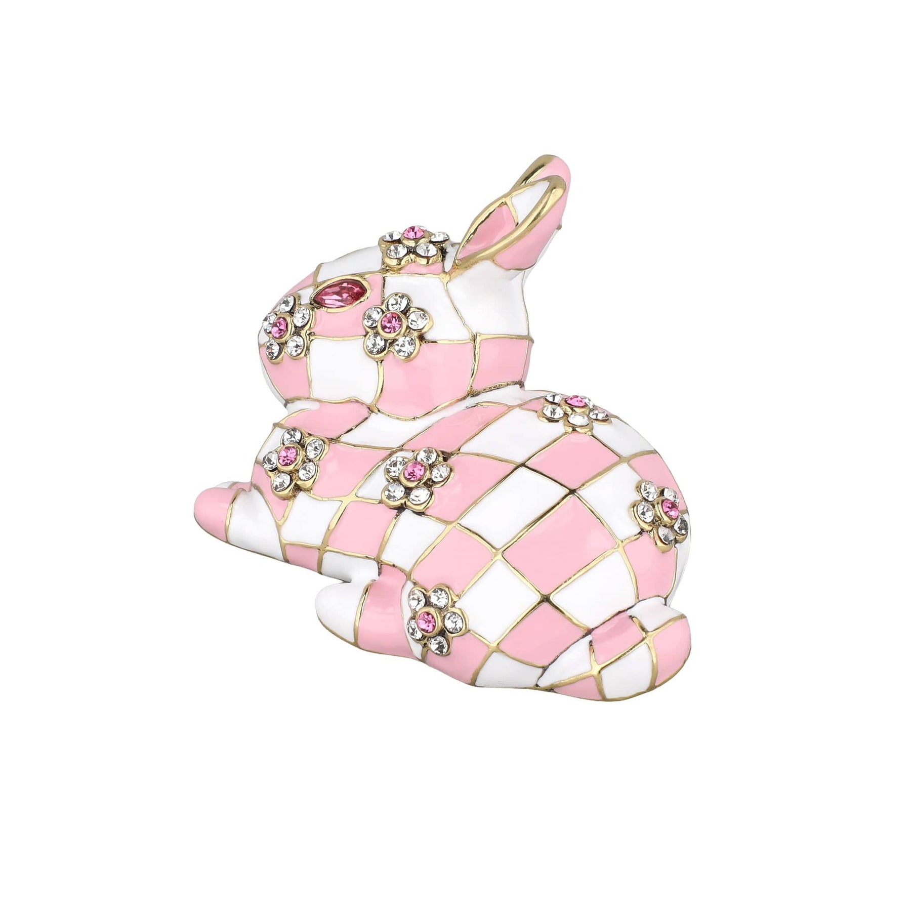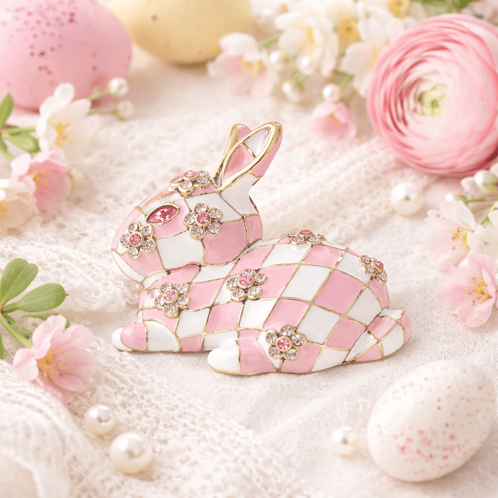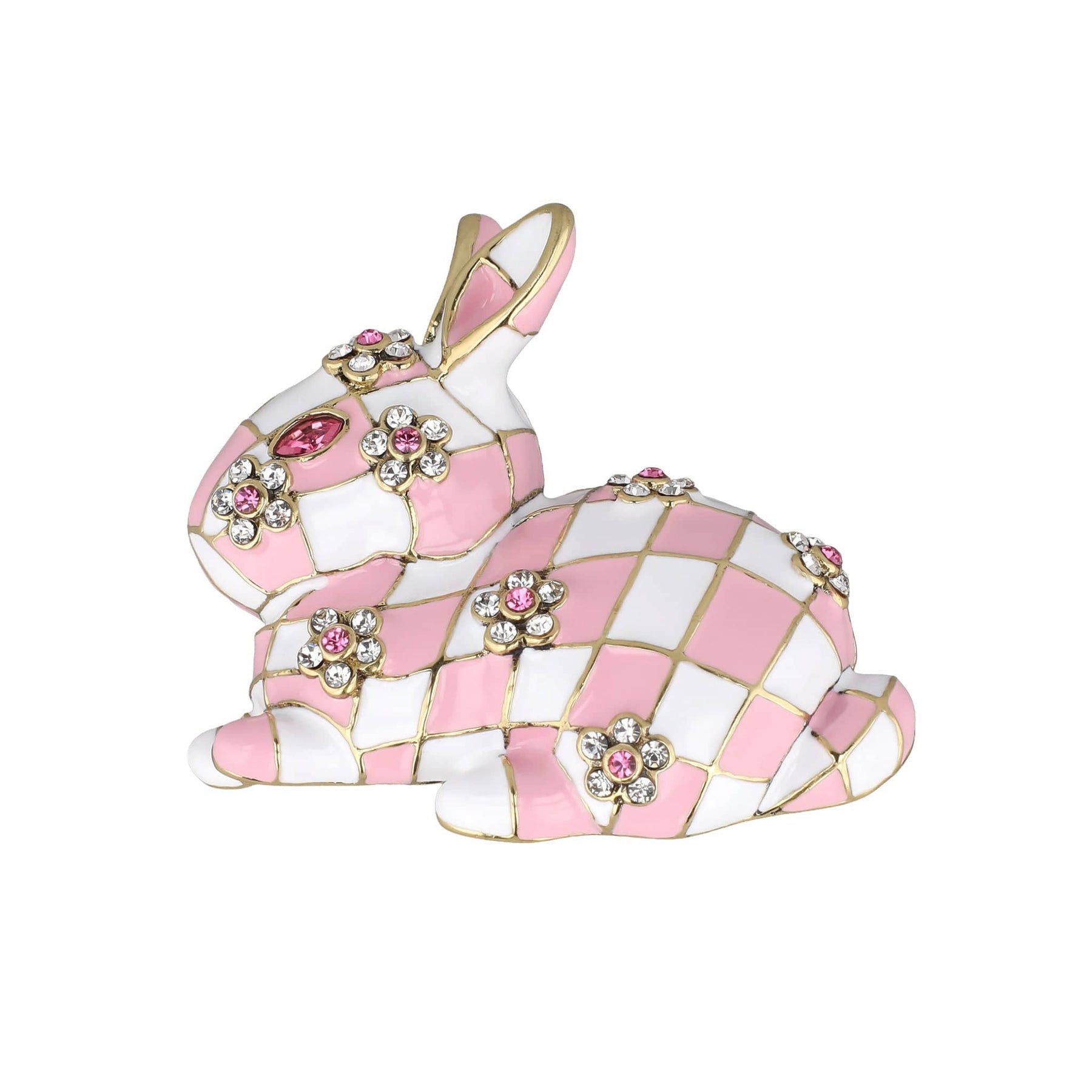 Rendered in a charming harlequin-inspired checkered design, this delightful bunny is dressed in blush pink and crisp white enamels, each panel outlined in gleaming gold-tone detail. Sparkling rose and clear crystals bloom across her silhouette like tiny spring posies, adding just the right touch of Heidi Daus magic. From her alert ears to her perfectly poised posture, every detail feels joyful, collectible, and irresistibly charming.