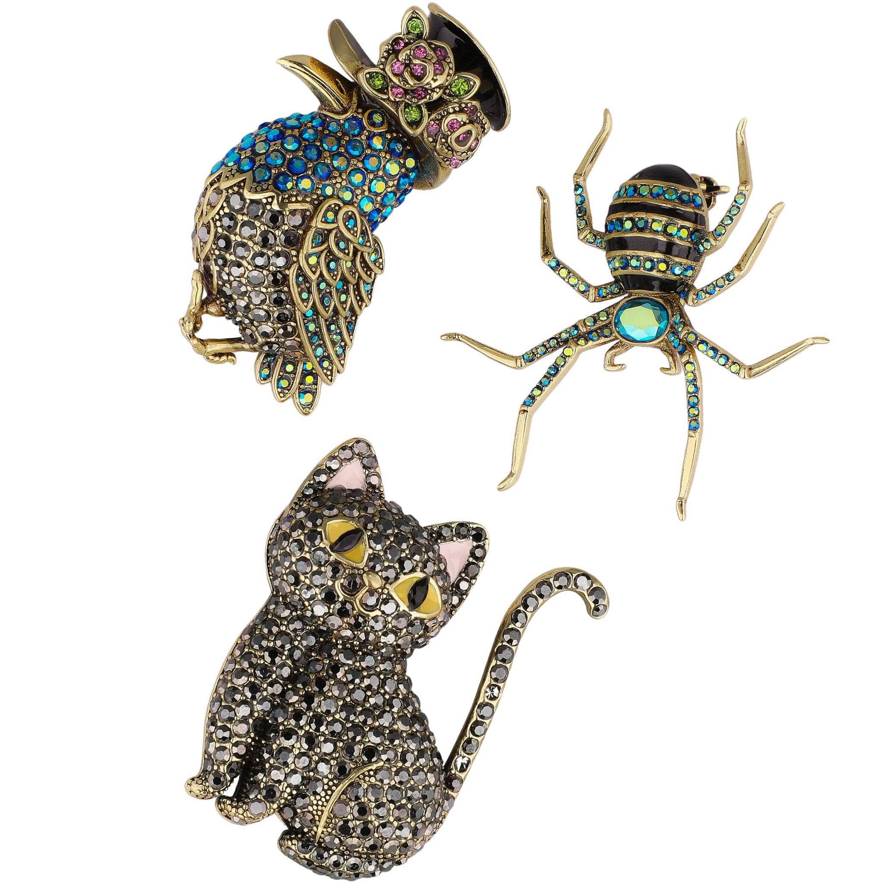Designed to be worn together or separately, each piece invites playful styling. Perch the raven on a blazer lapel or cape for instant gothic flair, let the cat peek from a pocket or sweater for a touch of whimsy, or allow the spider to crawl across a scarf, handbag, or even a witch’s hat for maximum seasonal impact. Beyond everyday outfits, these pins are the ultimate costume finishers—perfect for elevating a witchy ensemble, adding sparkle to a gothic-inspired look, or transforming a simple black dress into a Halloween showstopper.