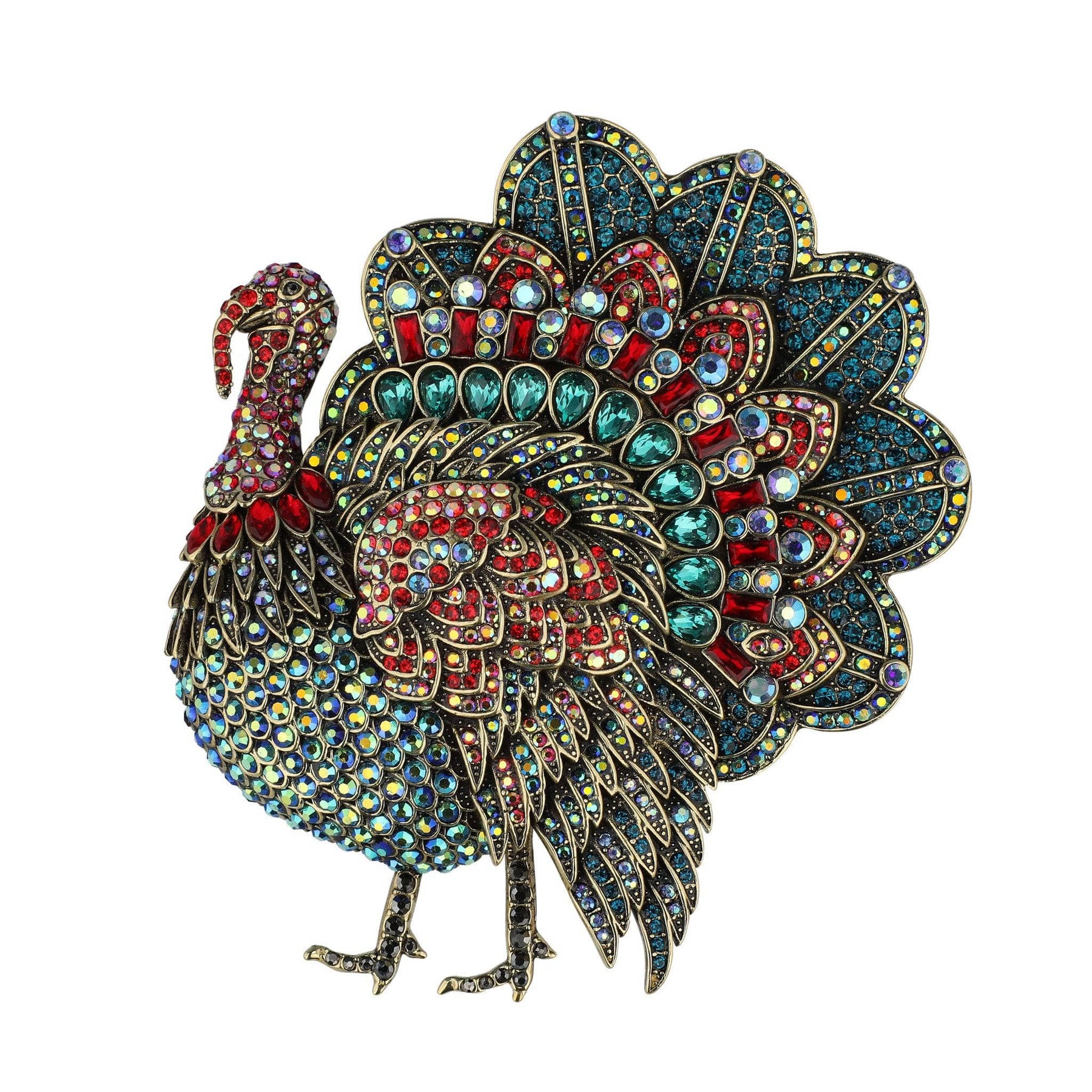 Colorful jeweled turkey brooch on a white background