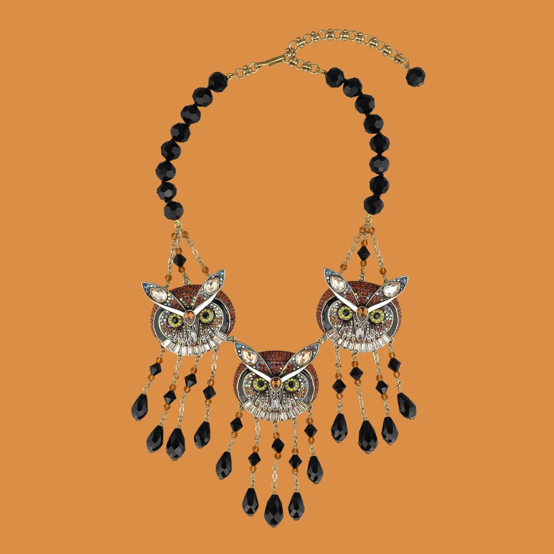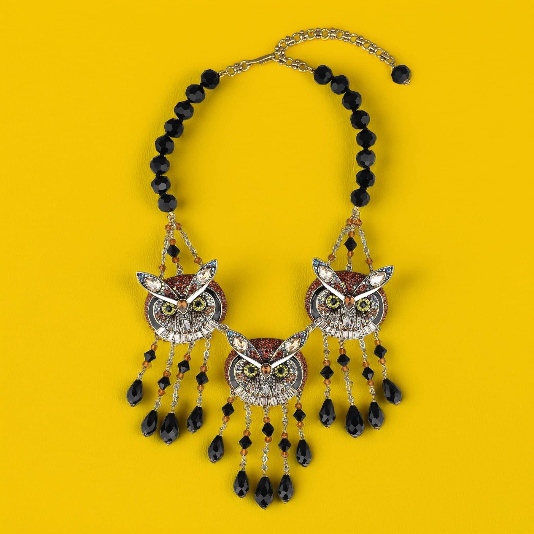 Step into the bewitching beauty of autumn nights with the “It’s Owl Or Nothing” Crystal Statement Necklace—a piece that feels plucked from the pages of a spellbinding story. With three wise, watchful owls rendered in dazzling crystal, enamel, and dramatic beadwork, this necklace is a powerful symbol of wisdom, mystery, and transformation. Just as the owl is the guardian of the night, this piece becomes your talisman—radiant, bold, and unforgettable.