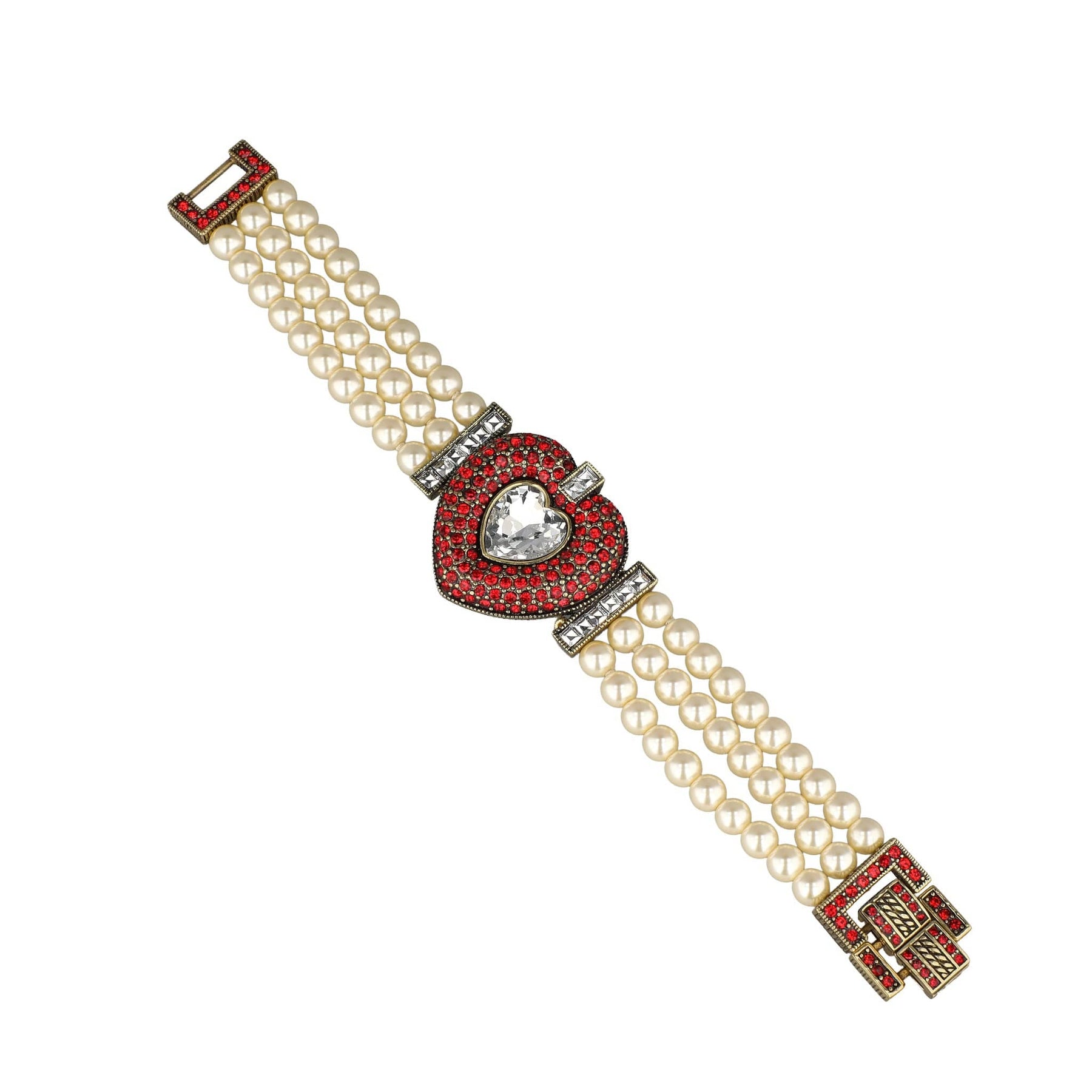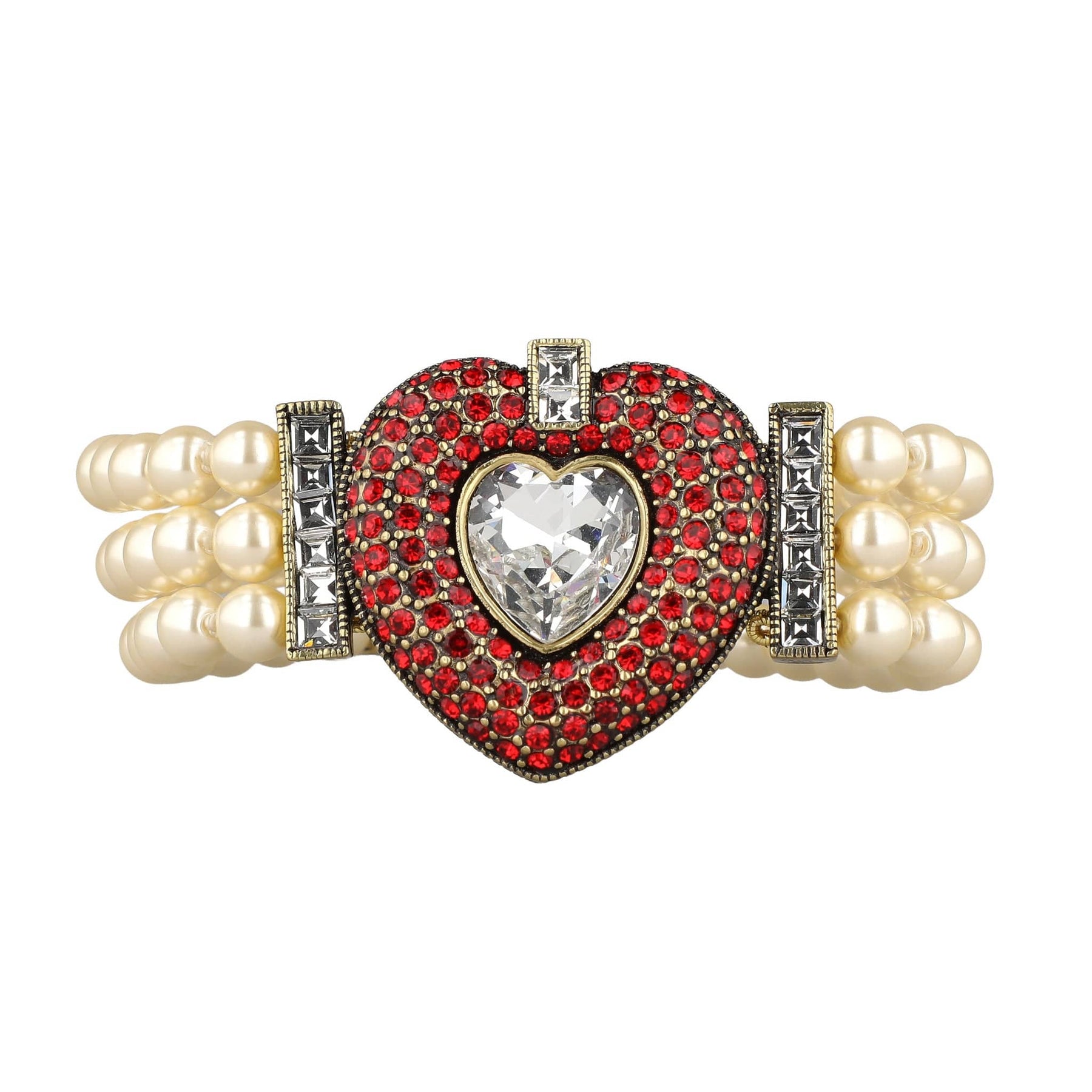 The “Be Mine” Crystal Heart Beaded Statement Bracelet captures that sentiment in a bold yet timeless design. Cream-toned beads form elegant strands that frame a striking crystal heart centerpiece, richly adorned with ruby and clear crystals. The layered heart layout creates depth, sparkle, and unmistakable presence—making this bracelet as impactful worn solo as it is paired with the matching necklace.