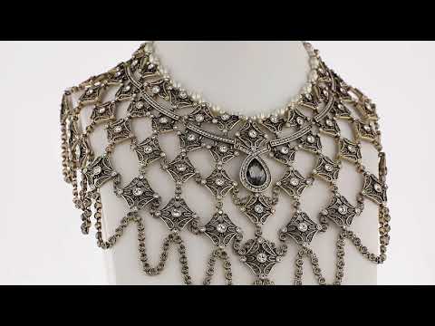 Inspired by the grandeur of historic lace collars and museum-worthy stonework, this extraordinary design unfolds across the neckline like a jeweled scarf—fluid, flattering, and impossibly elegant. Thousands of black diamond and clear crystals are meticulously arranged in an openwork lattice that feels regal without heaviness, dramatic without stiffness. Cream-toned beads softly frame the collar line, while a teardrop crystal crowned with a luminous pearl anchors the design in timeless sophistication.