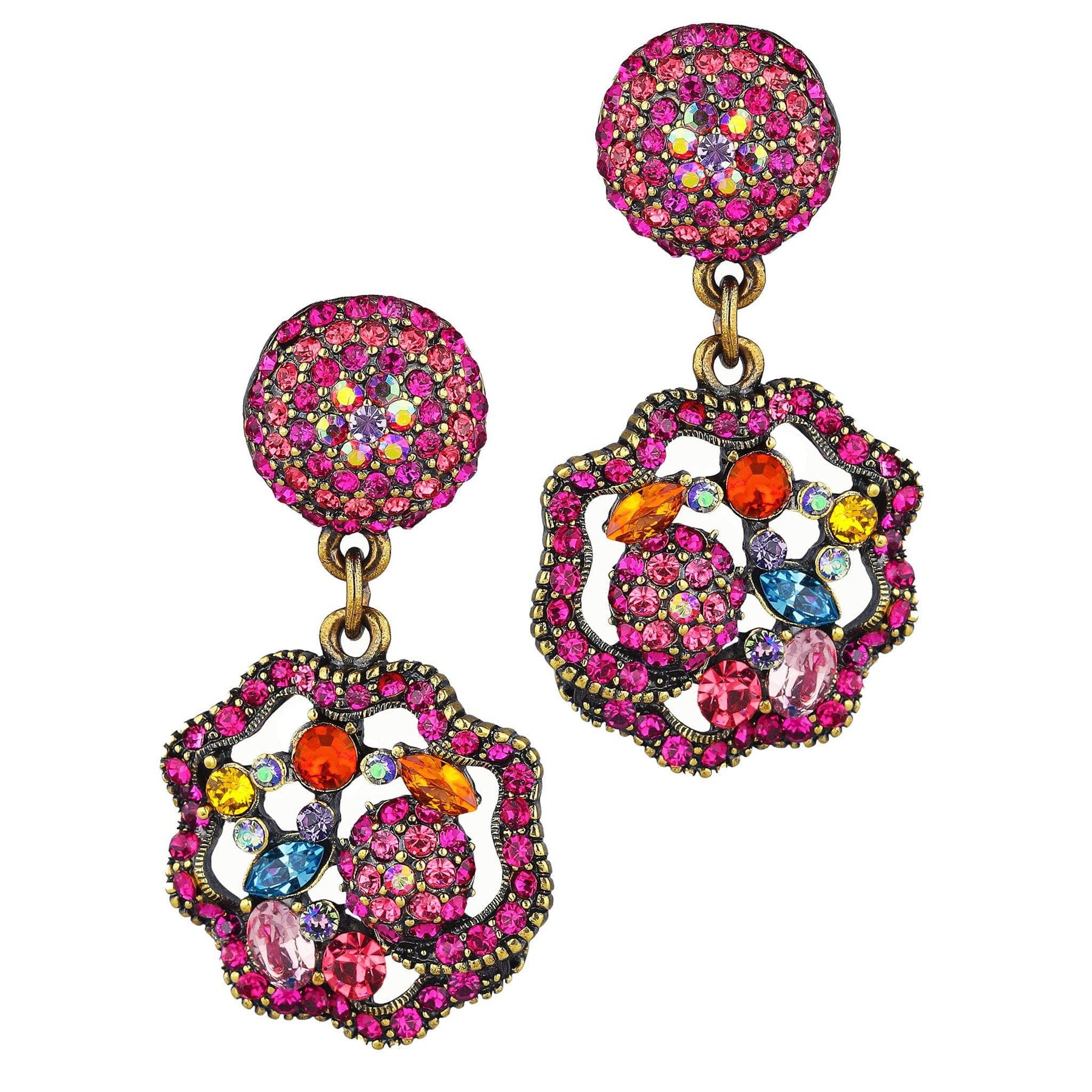 Each earring begins with a vibrant fuchsia crystal button top, leading to an openwork floral drop shimmering with a kaleidoscope of fuchsia, rose, aqua, topaz, hyacinth, padparadscha, and violet crystals. The design dances with light, echoing the richness of September sunsets and fall blooms.